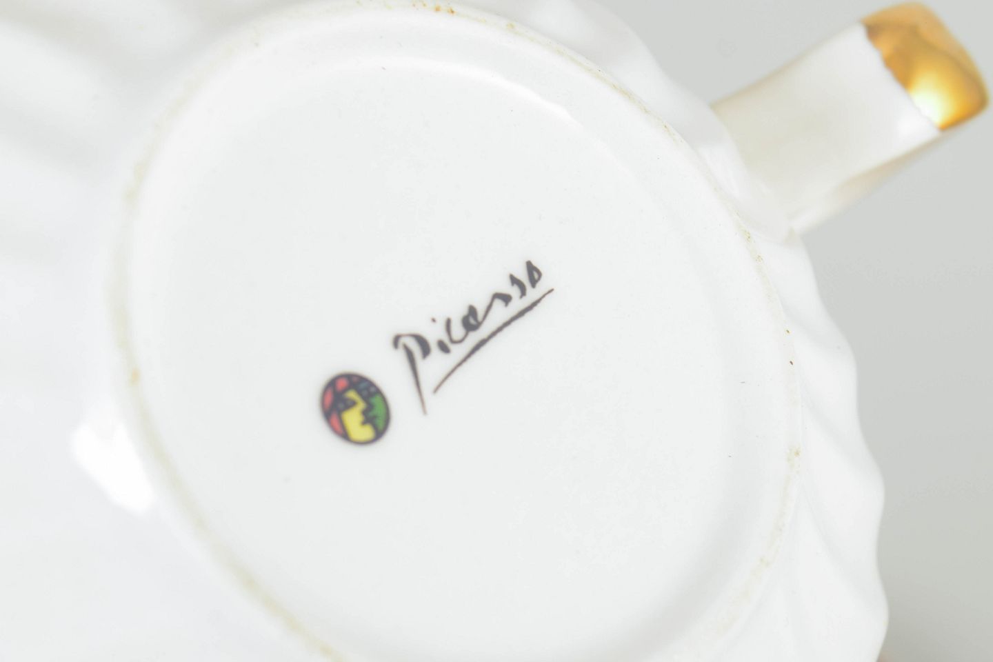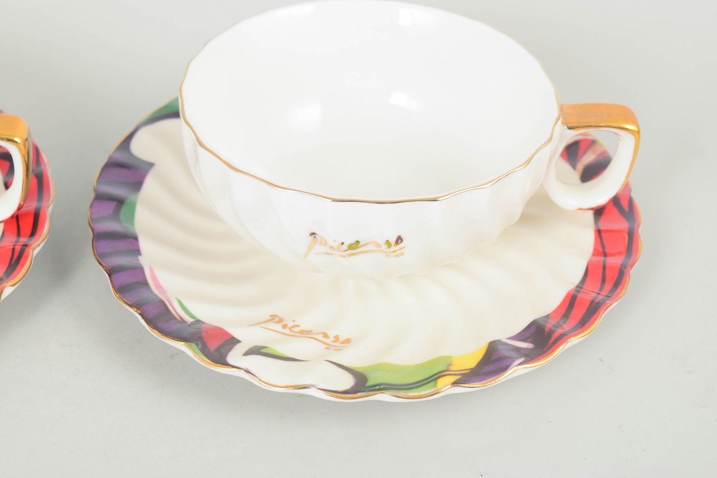 Two large teacups with matching saucers, marked Picasso. The cups have an elegant shape with gilt rims and multicoloured decoration along the border of the saucers.