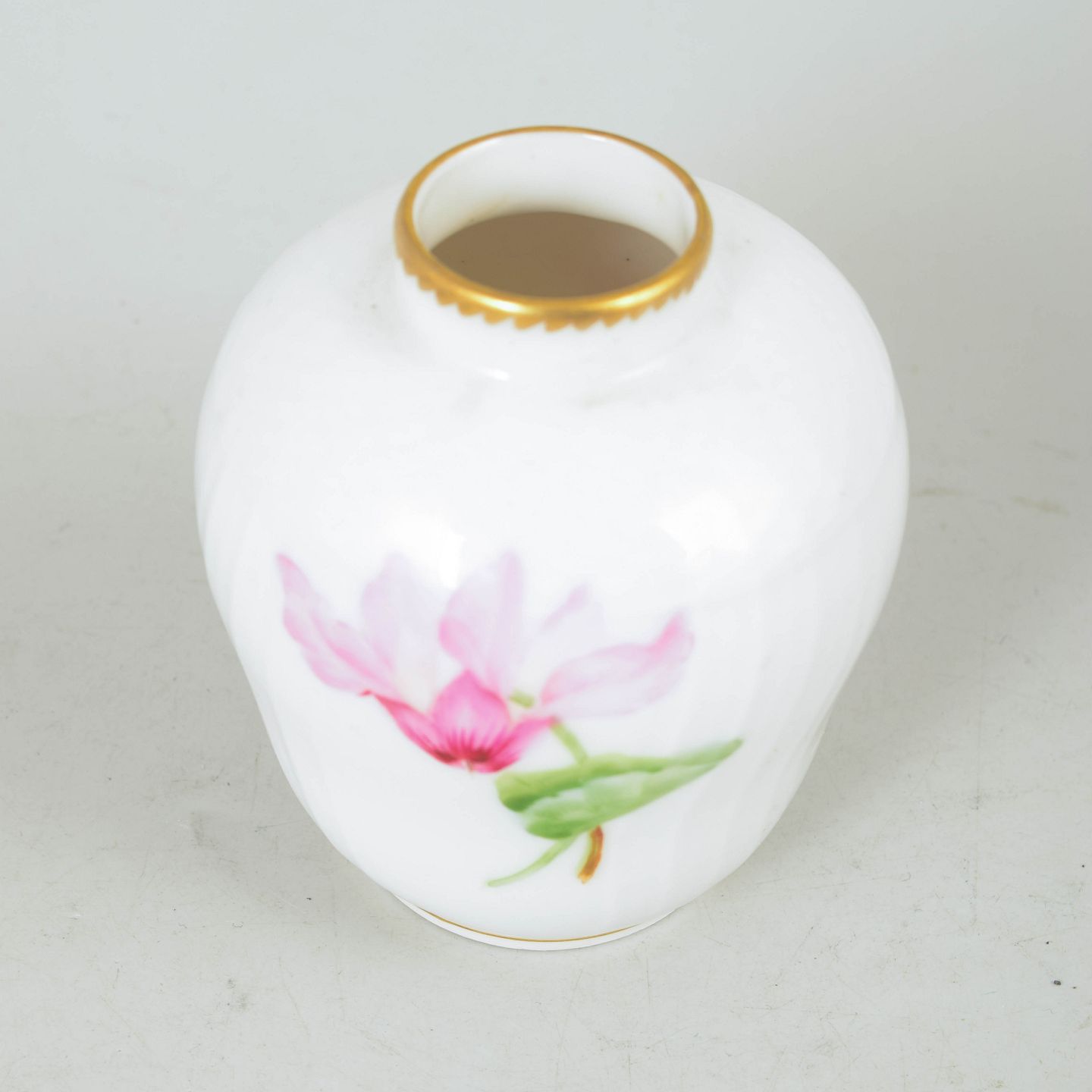 Hand-painted porcelain vase decorated with Saxon flower motif on white glaze, finished with gilded rim at the neck and foot.