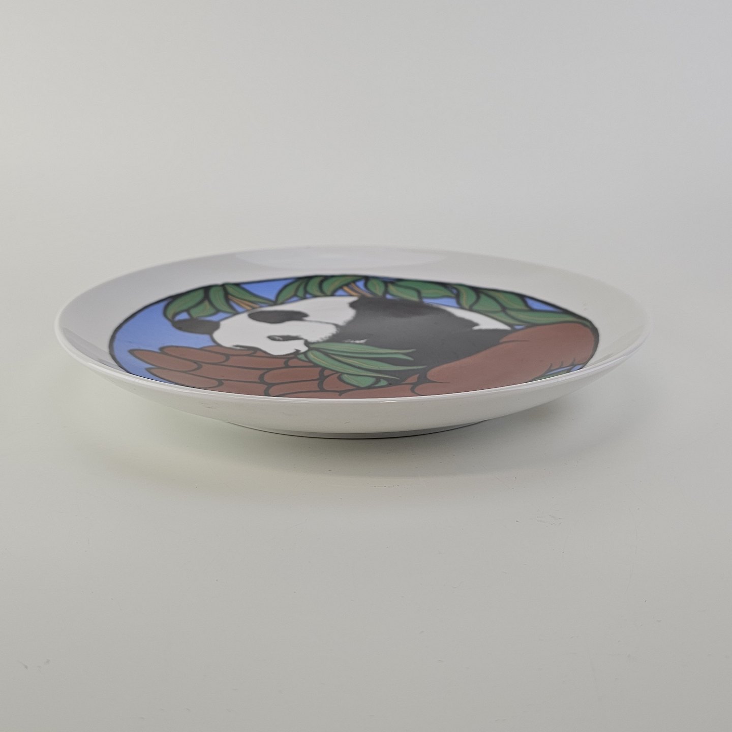Text available in Danish: Platte af kongeligt porcelæn med motiv af en panda, som sidder i en åben hånd. Nr. 307/1000
