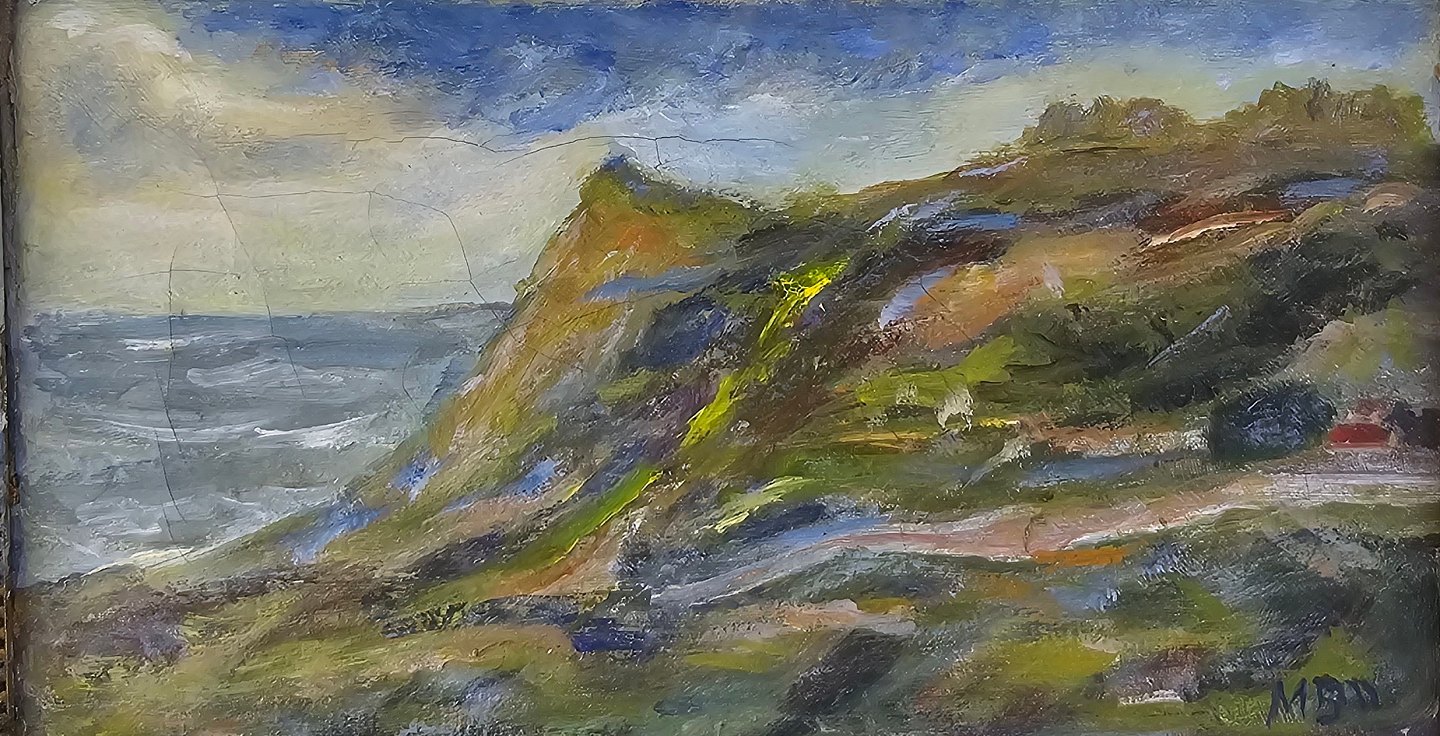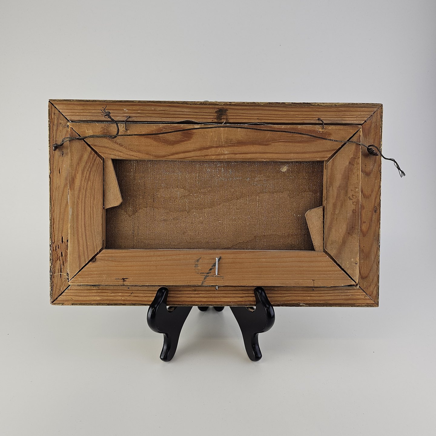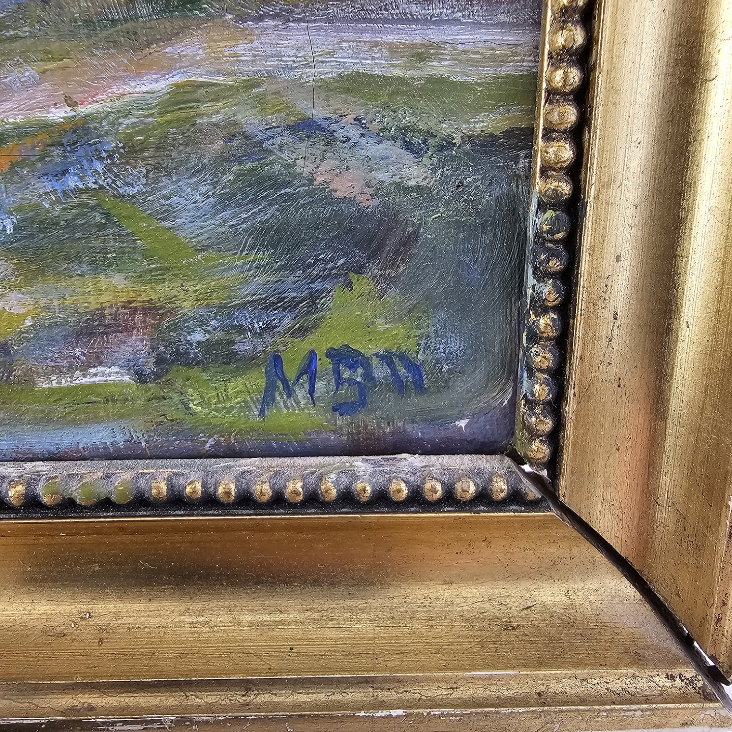 Oliemaleri på lærred med naturmotiv monteret i guldmalet træramme