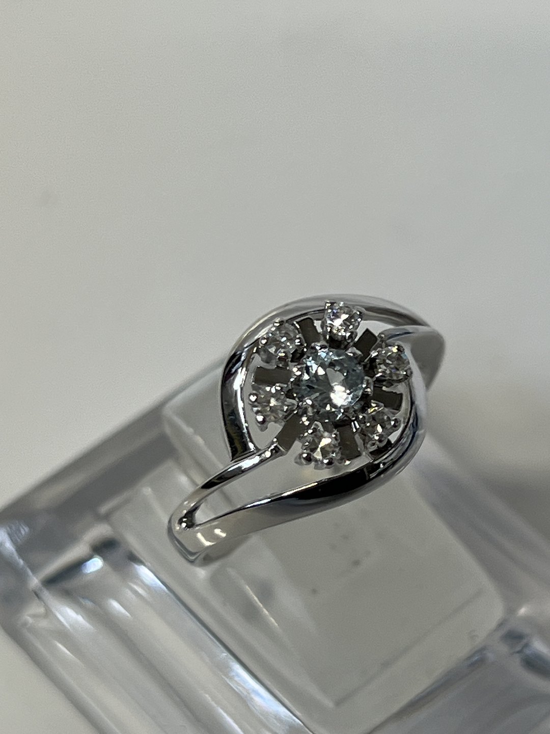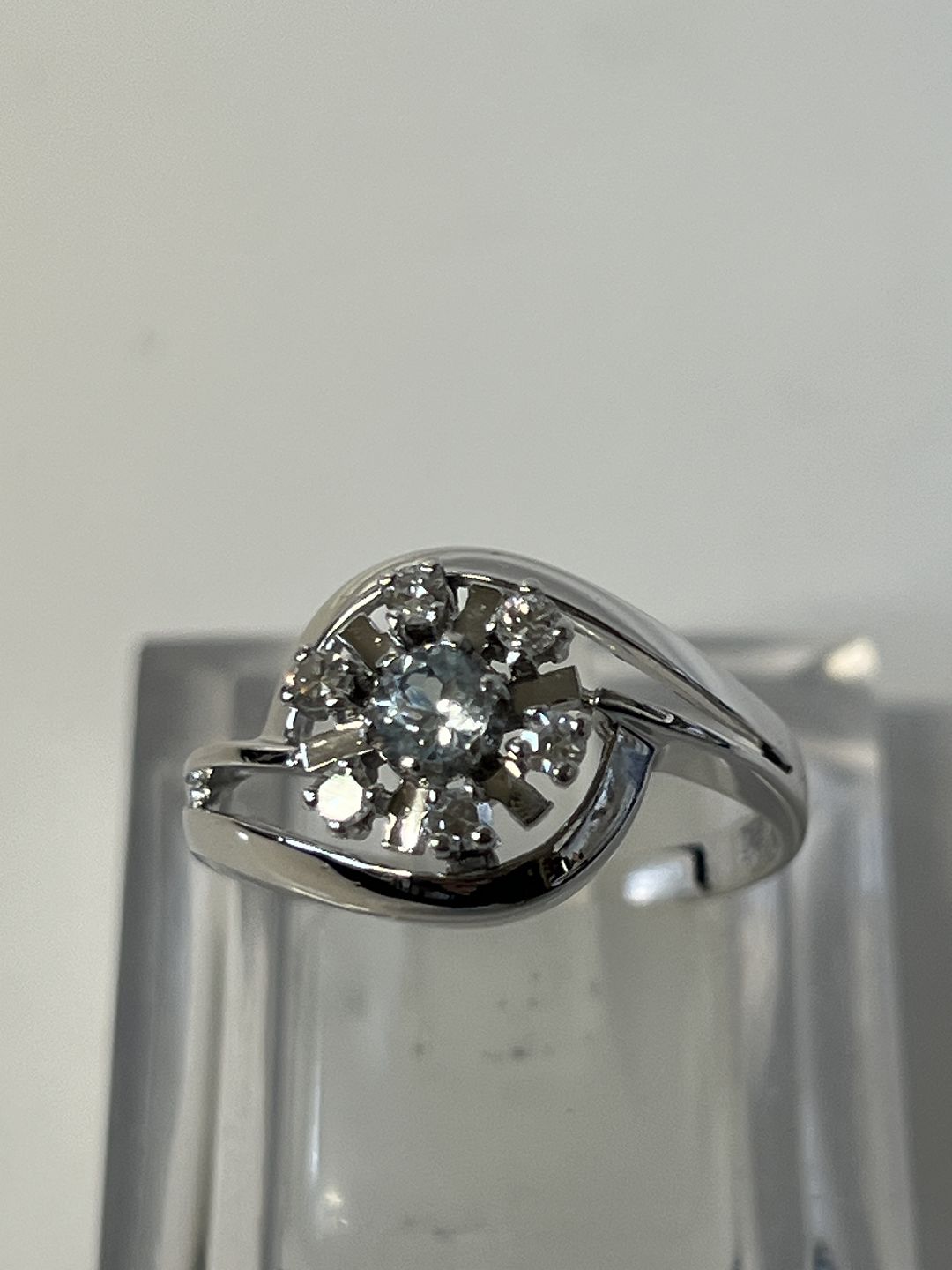Damering, med indlagt lyseblå sten og brillanter, i 14 karat hvidguld.