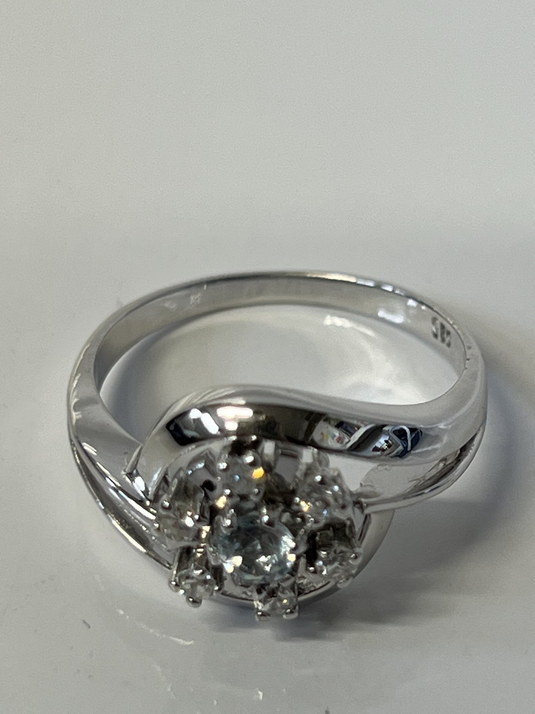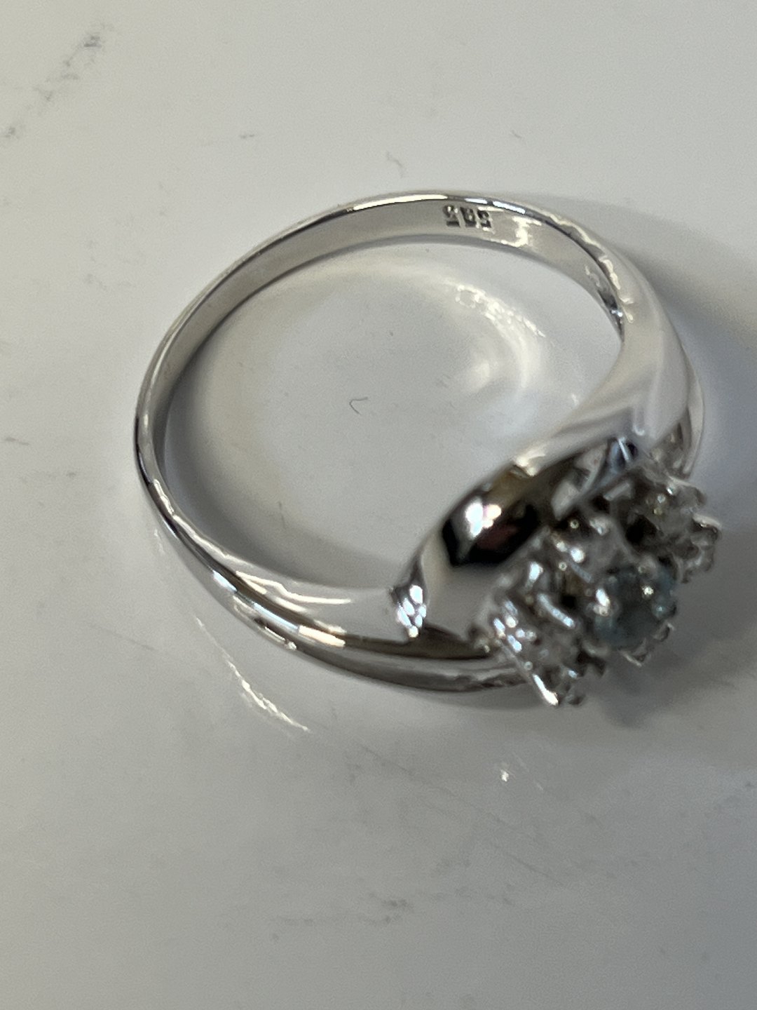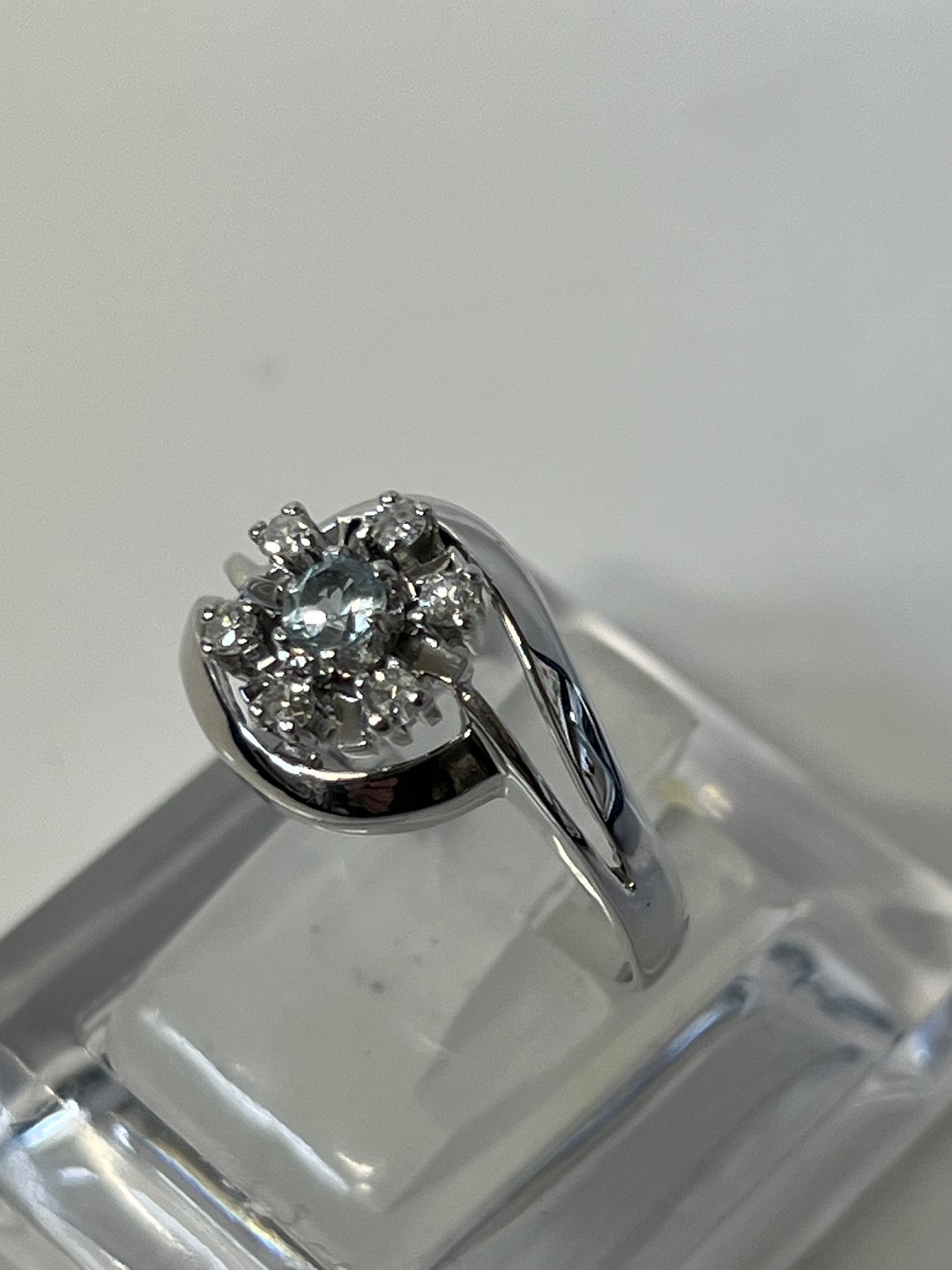 14 karat Damering, med indlagt lyseblå sten og brillanter, i hvidguld.