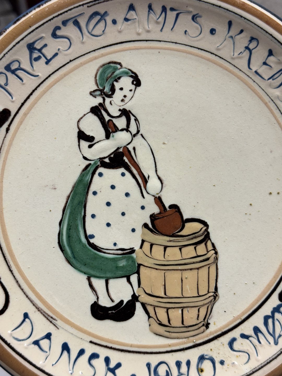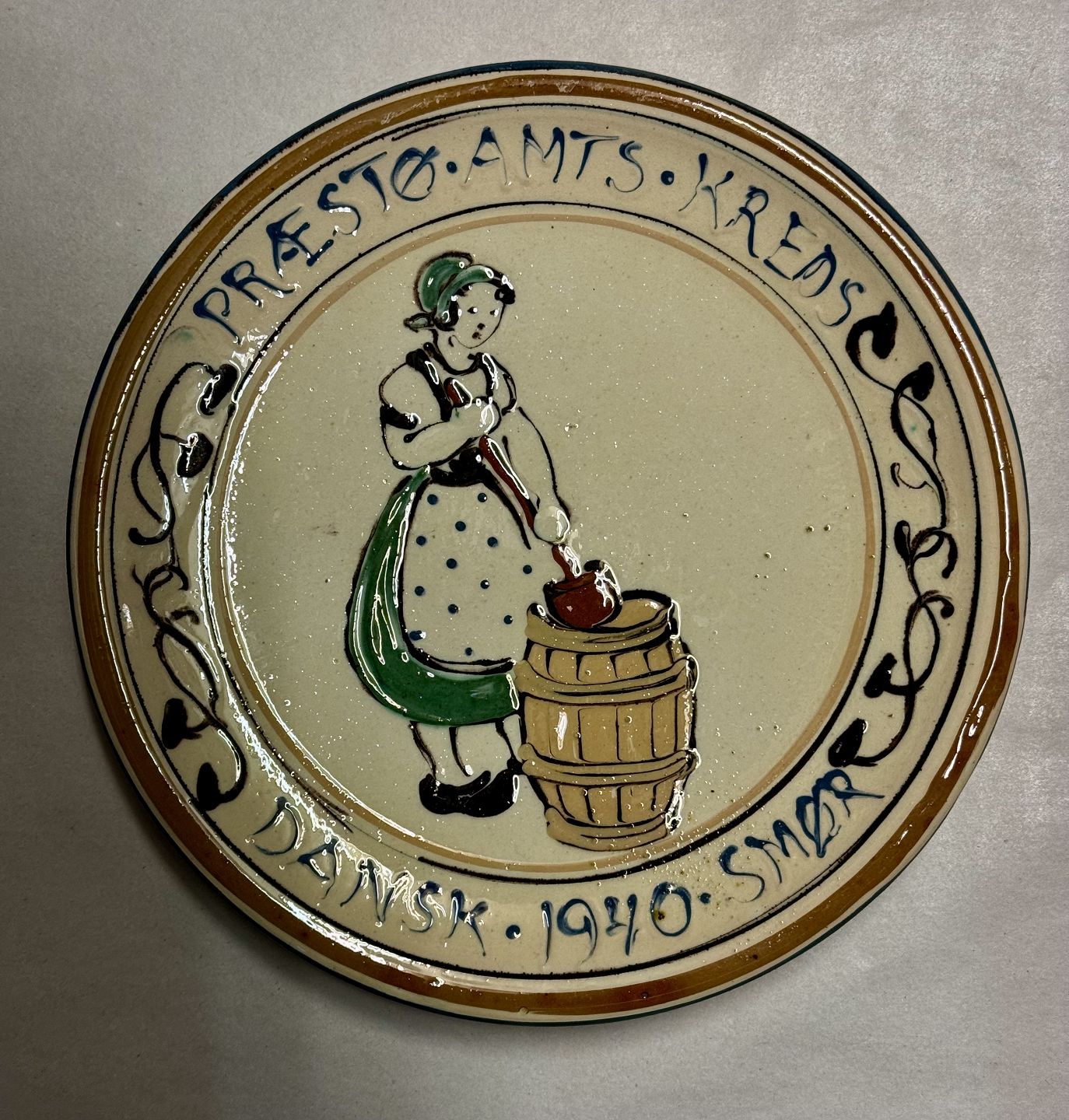 Præstø, Smør platte fra Kähler fabrikken med bemalet motiv med malkepigen, der kærner smør. Plattens tekst: “Præstø Amts Kreds Dansk 1940 Smør. Fremstår i god stand. Kähler fabriks logo på bagsiden. Ø. 20,7 cm