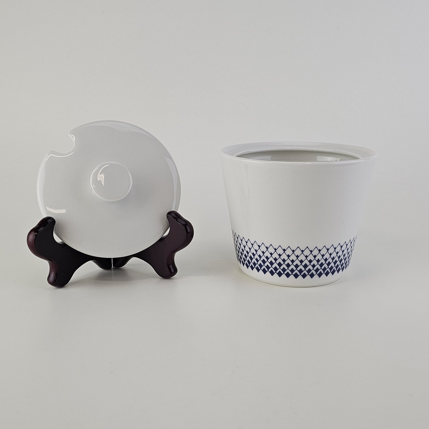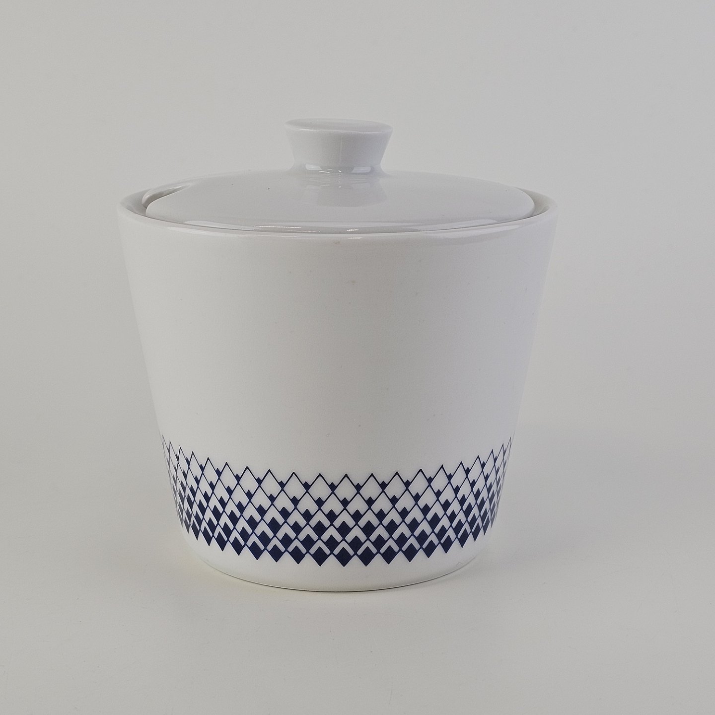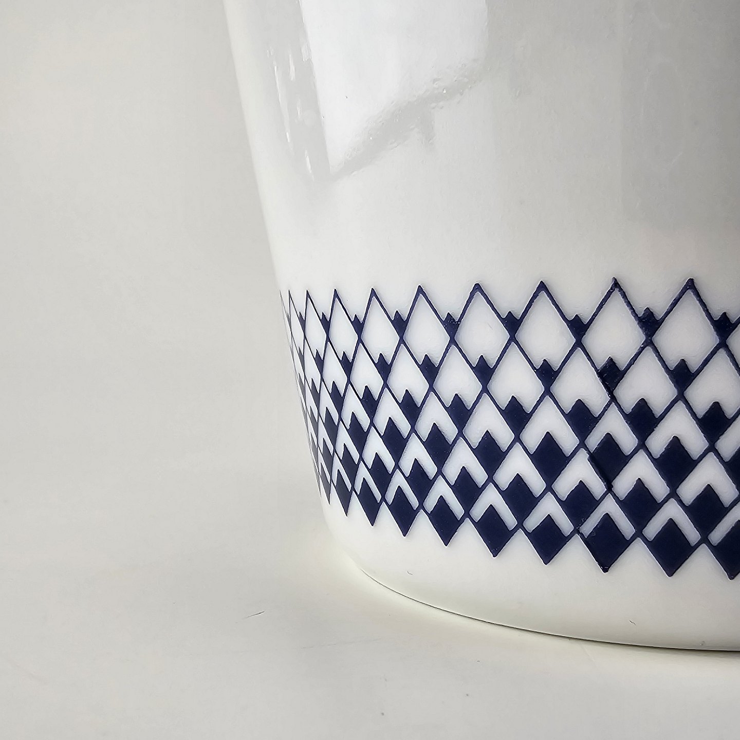 Stellet er hvidt porcelæn dekoreret med blå romber