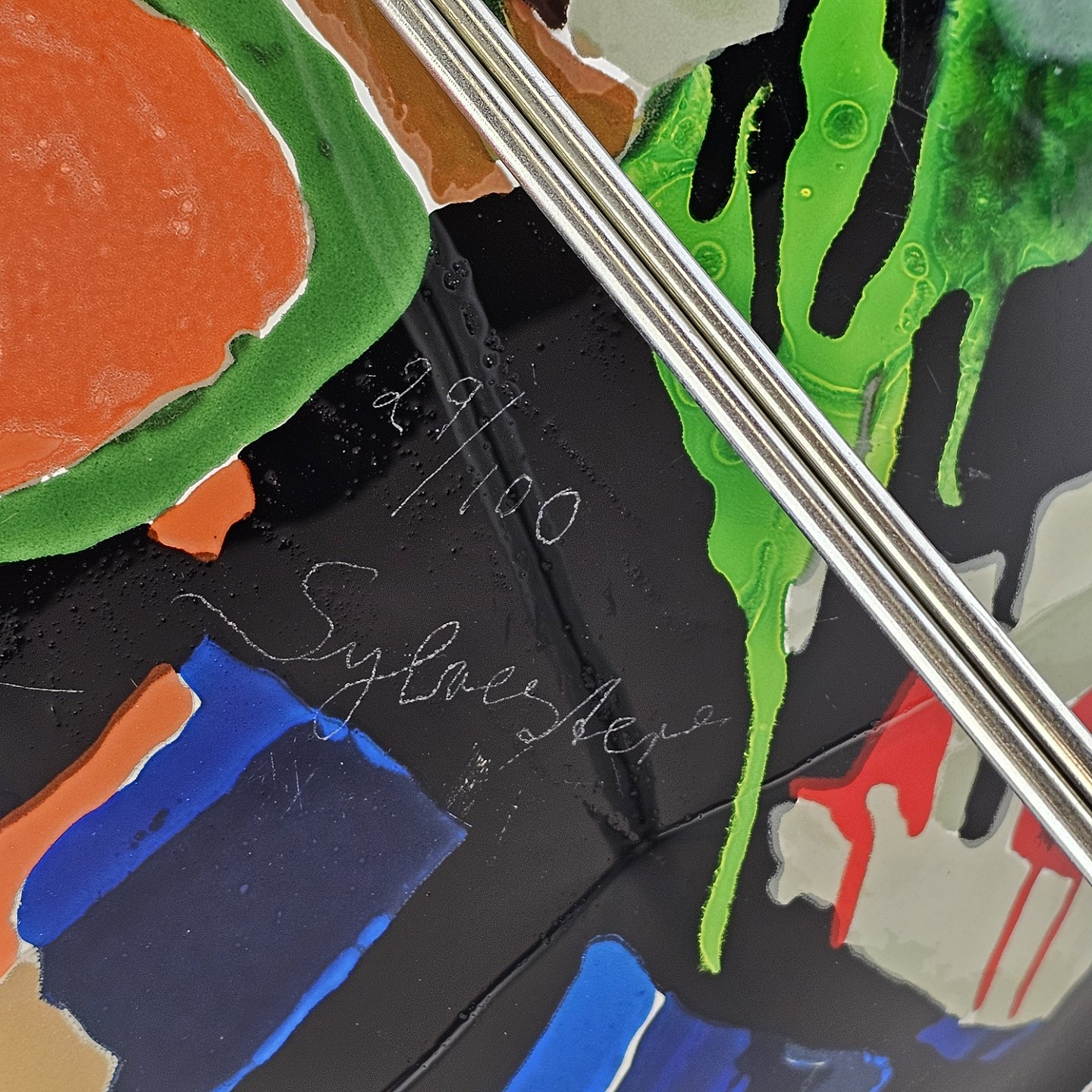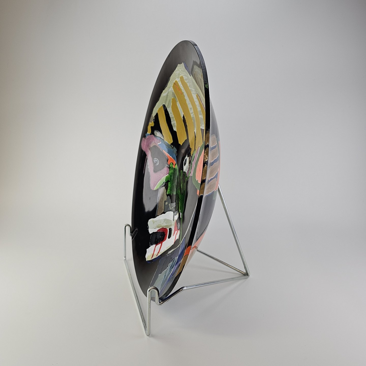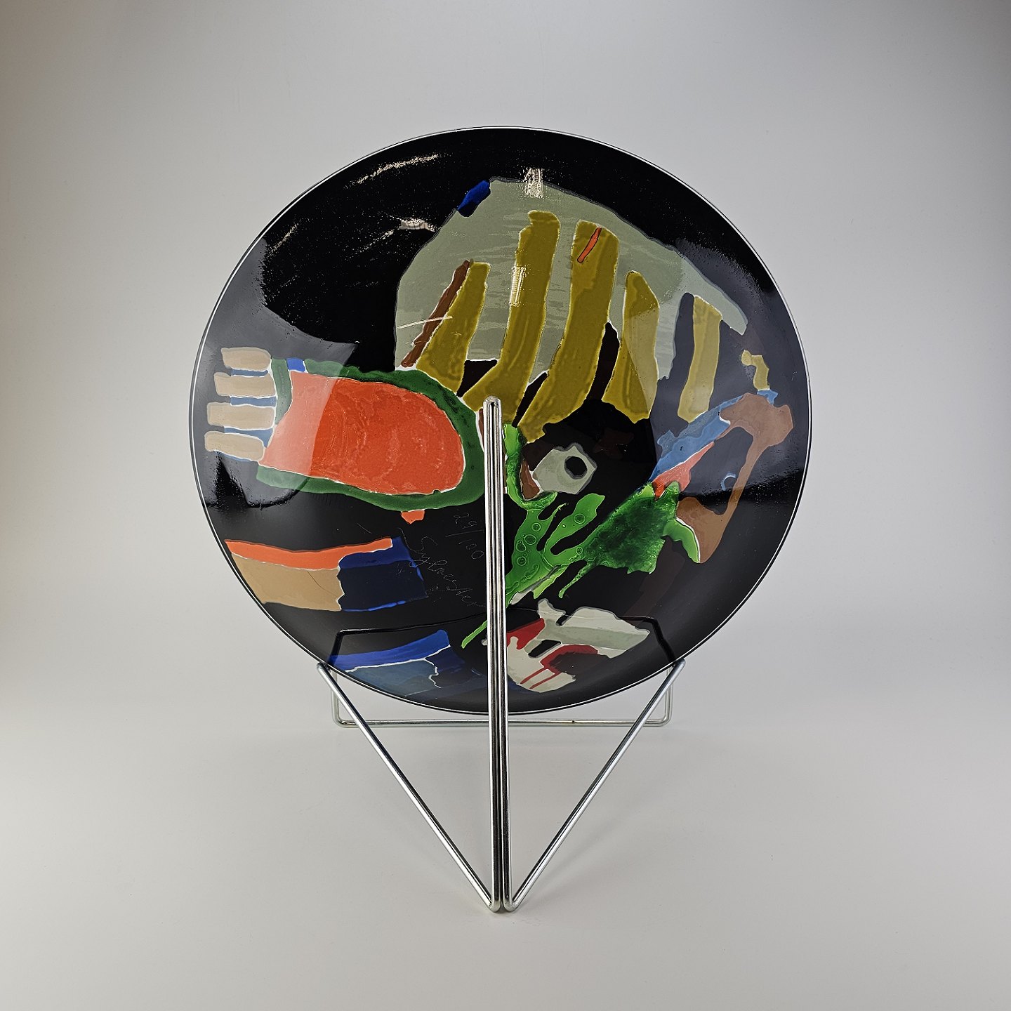 Platte i glas med abstrakt motiv i flere farver på sort baggrund