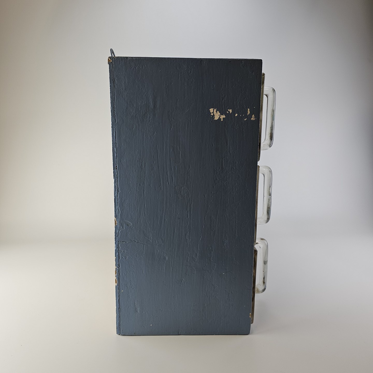 Fremstår med brugsspor på malingen på begge sider, små mærker på glas skufferne og et afslag på bagsiden af den ene skuffe