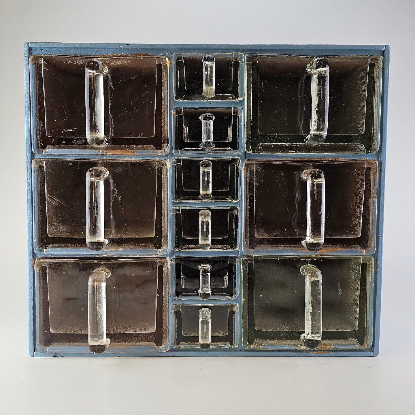 Flot patineret krydderihylde i blåmalet træ med skuffer af glas og to træskeer. Har 6 store skuffer og 6 små skuffer