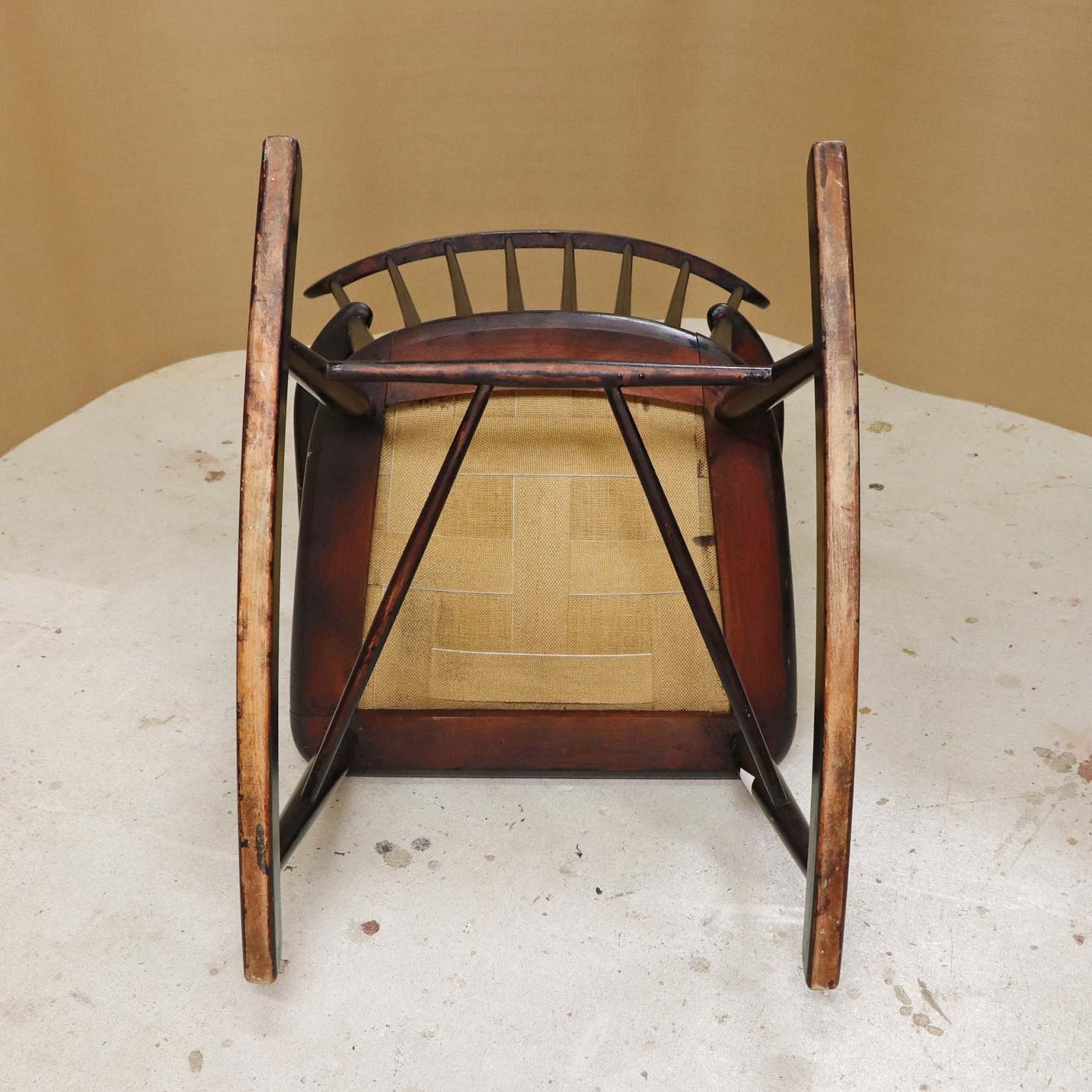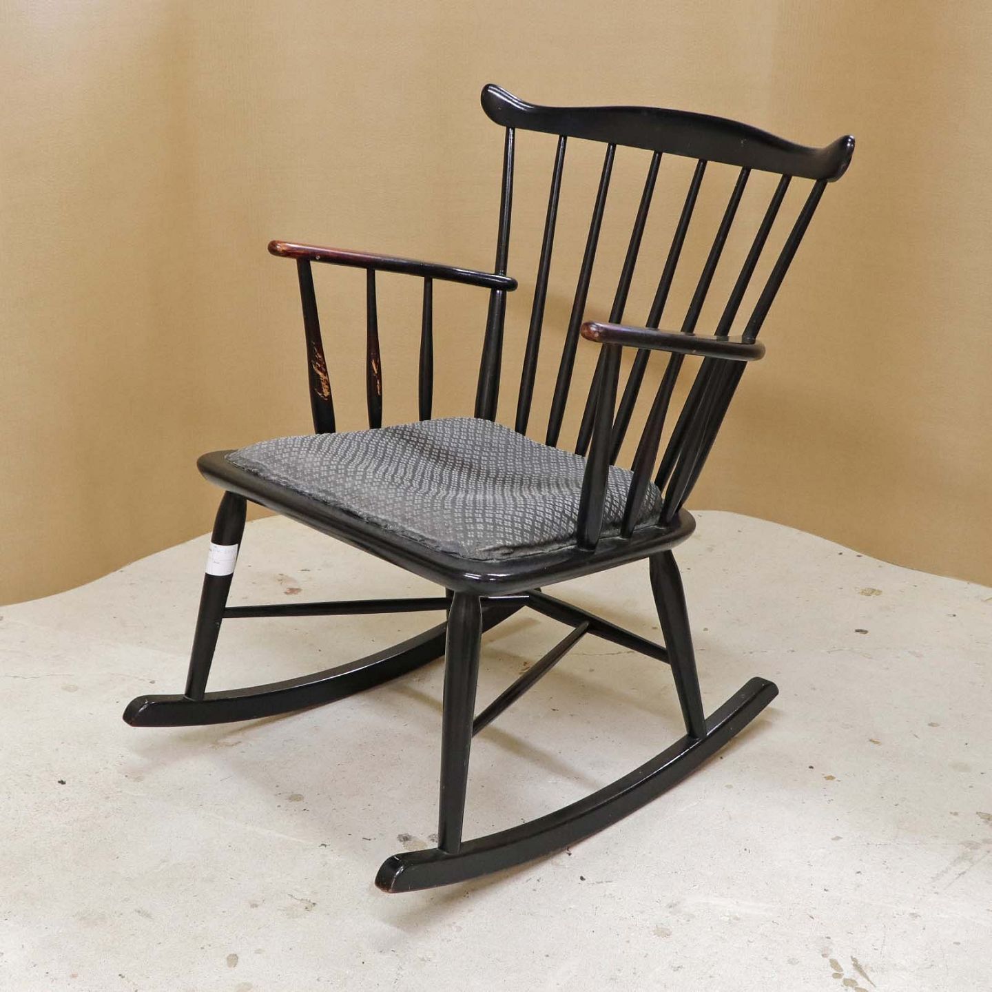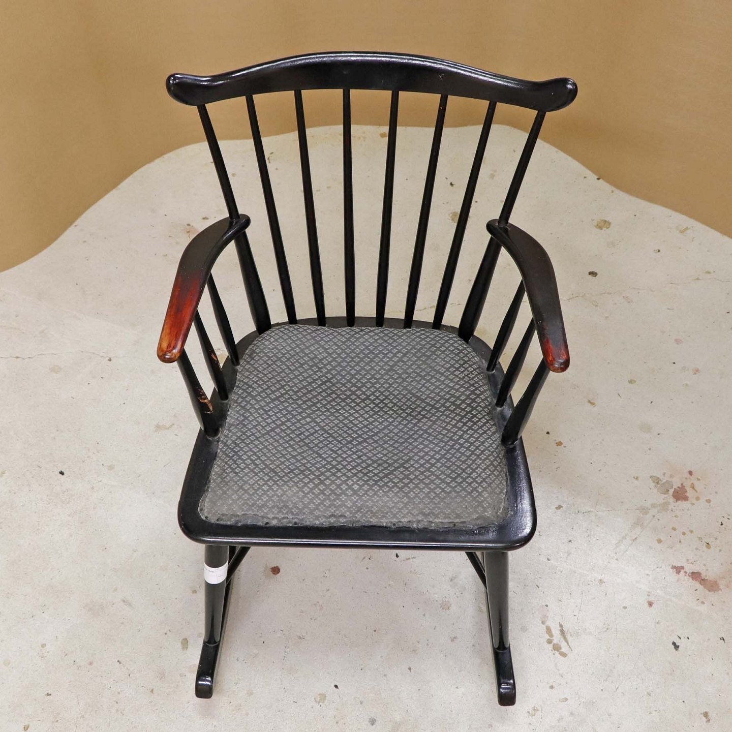 Tremme gyngestol i sortlakeret træ med fastmonteret polstret stofbetrukket sæde i grå farve med lyst mønster. Model 181
