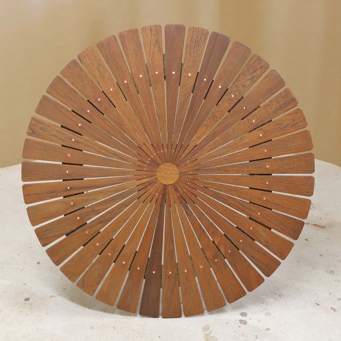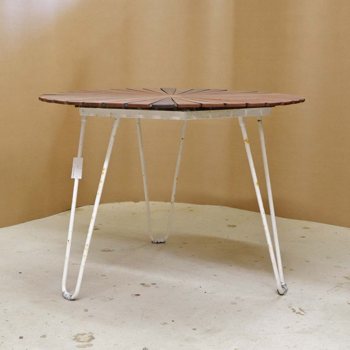 Rundt havebord fra år 1950-60 med nyrenoverede lameller i teaktræ med messingpynt på stel af hvidlakeret stålrør. Benene er ikke renoveret.