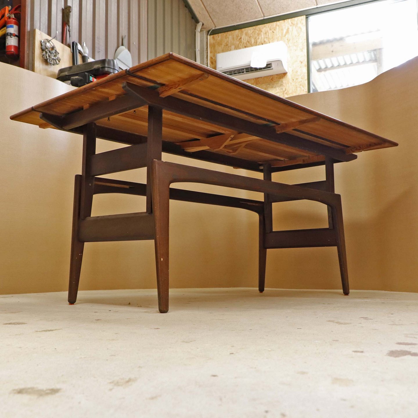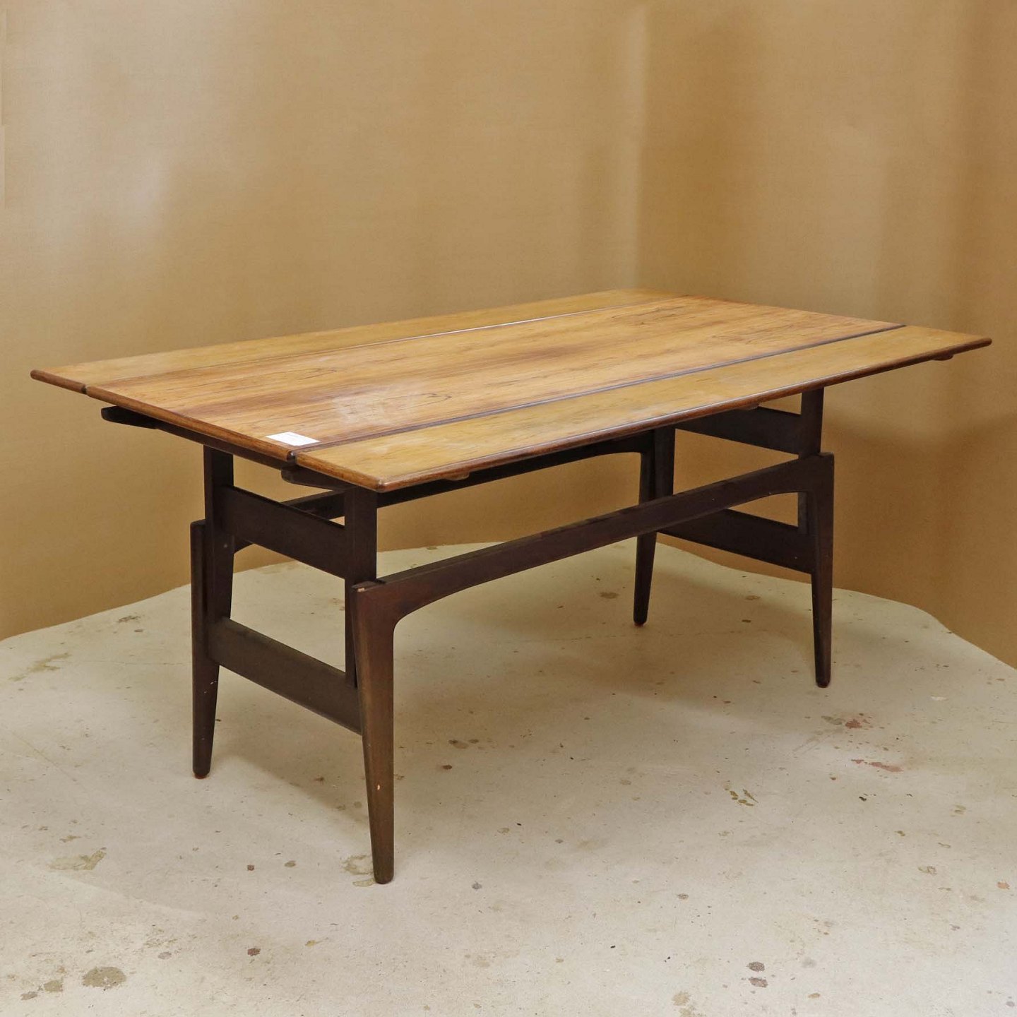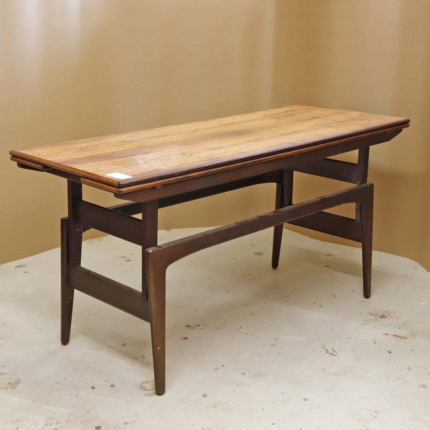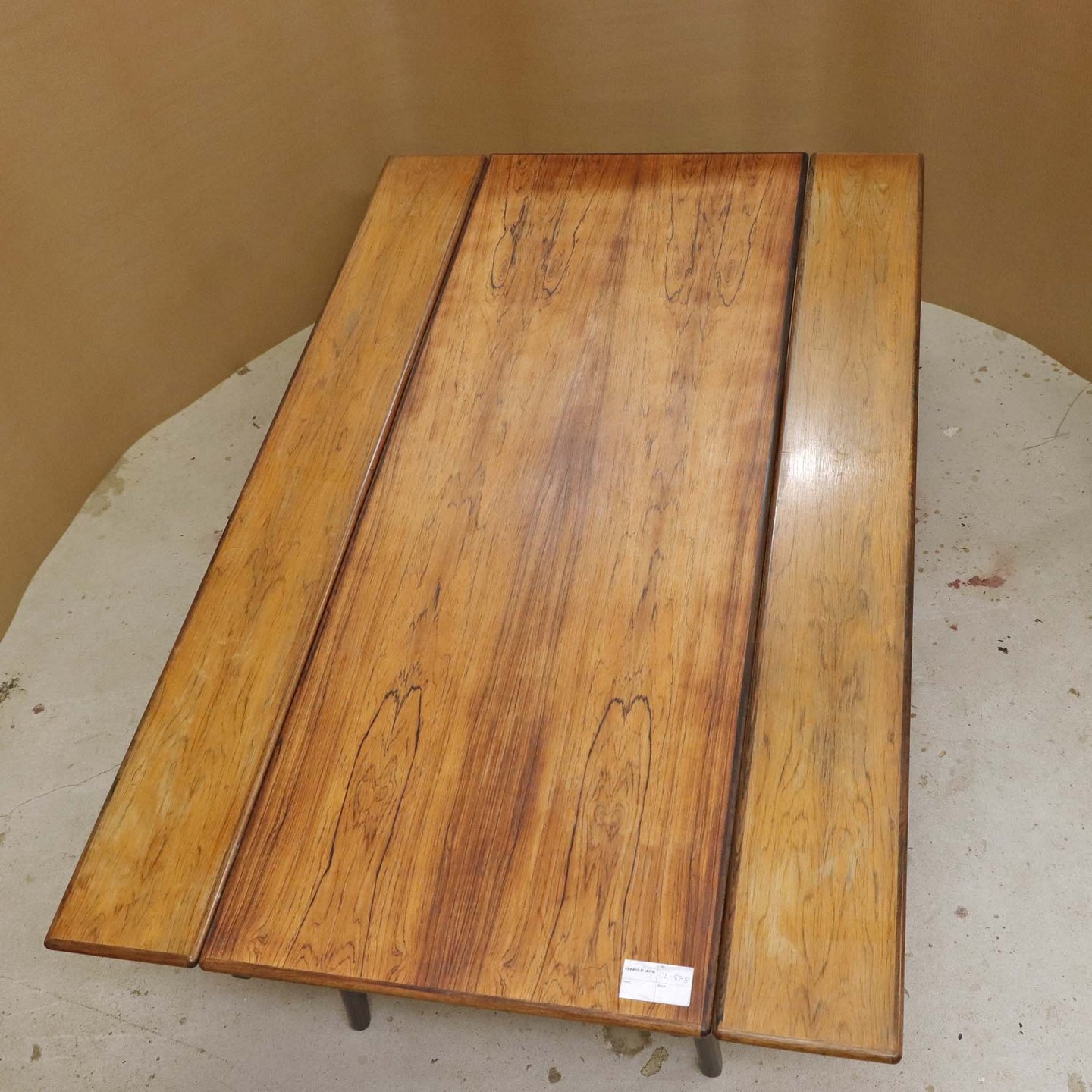 Fremstår med ridser på toppladen, vandmærker på udtrækspladen samt to mindre afslag på stellets topkant samt på et enkelt bordben.