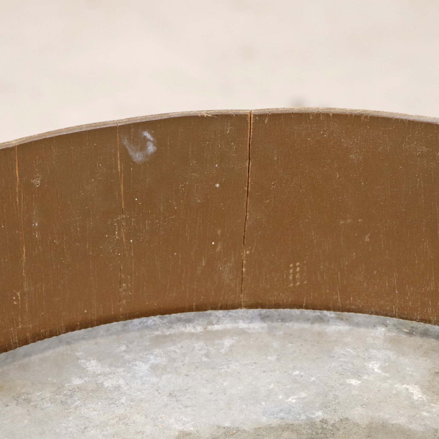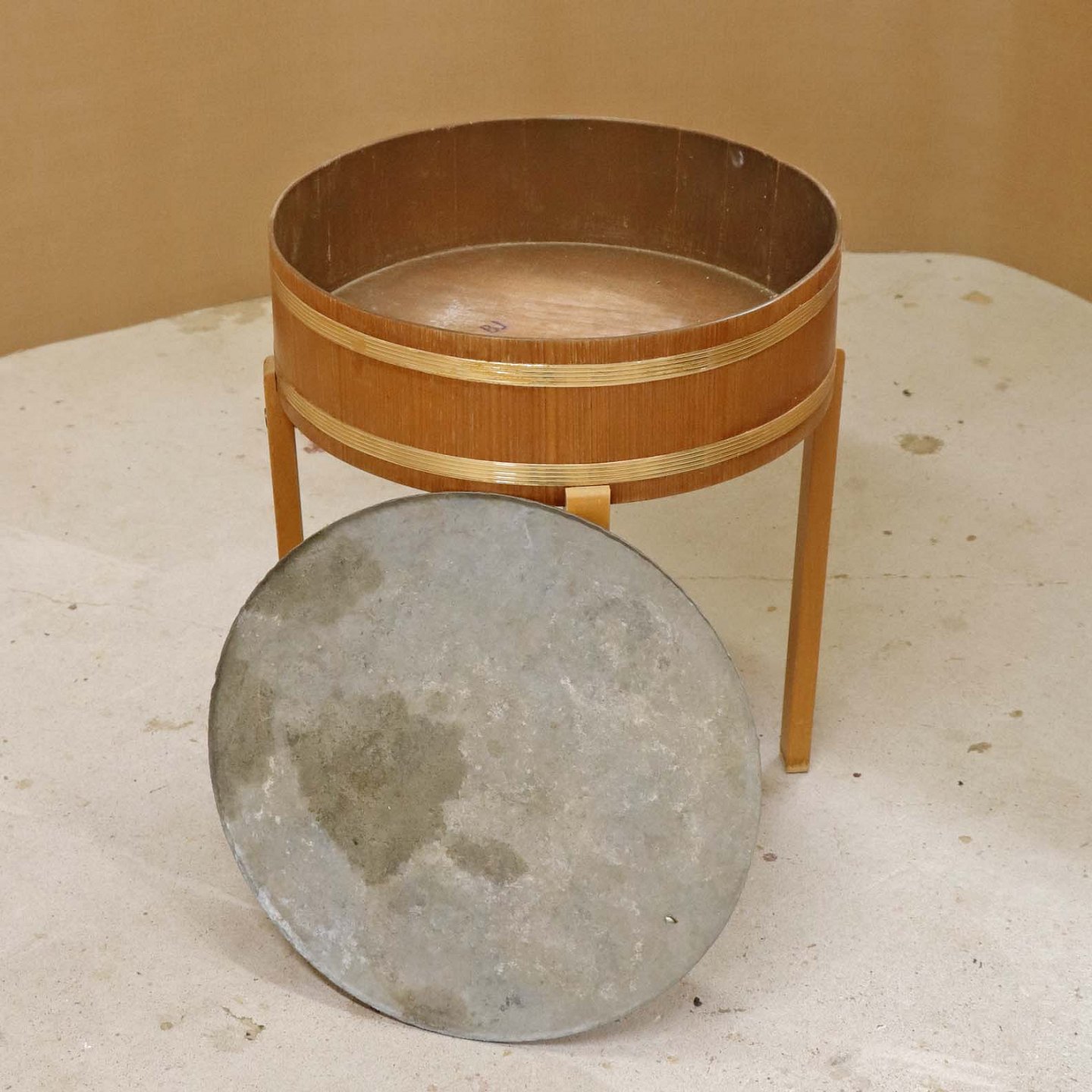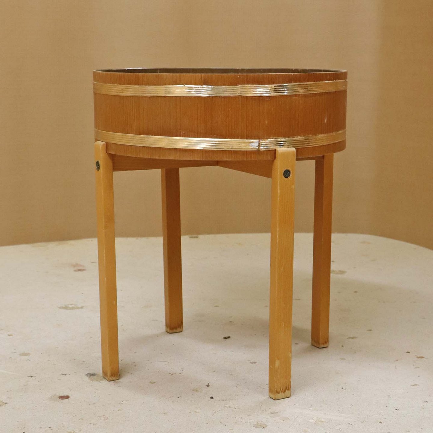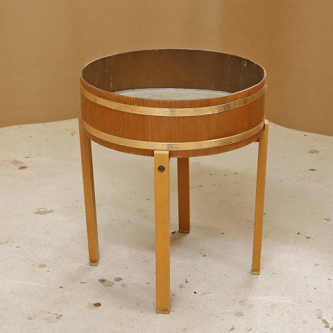 Tøndeformet kumme til blomster med stel i lakeret bøgetræ og ramme i teaktræ med gyldne dekoraktionsbånd og aftagelig bundplade i zink.