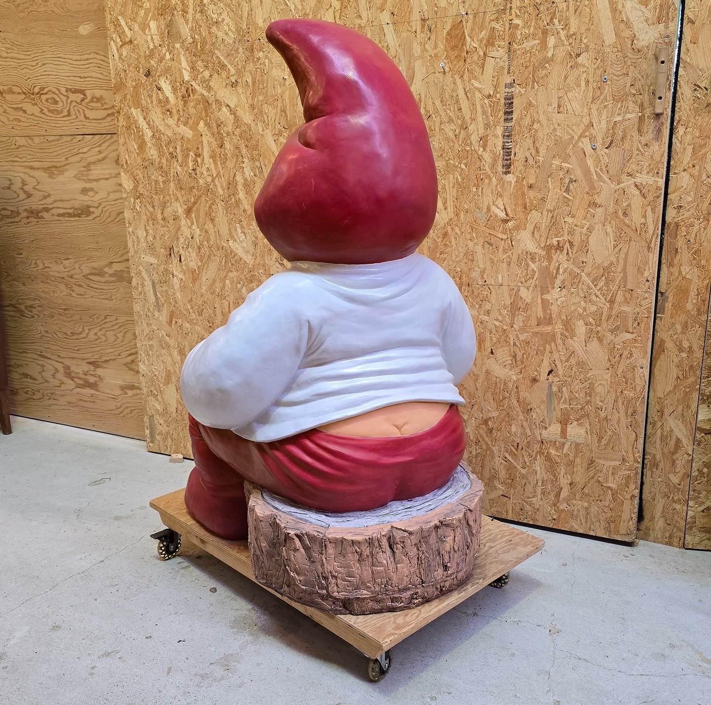 Stor udstillingsmodel i malet glasfiber med motiv af Klarborg nissen Oscar fra åretsnissepar år 2001, som sidder på en træstub. Figuren er fremstillet i et begrænset antal.