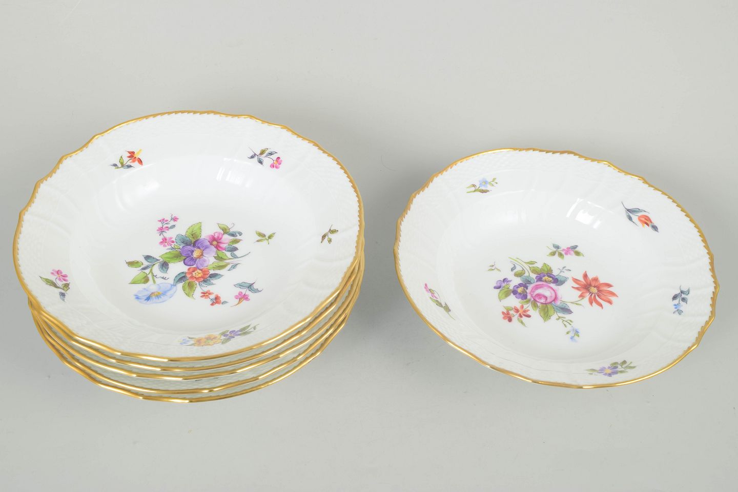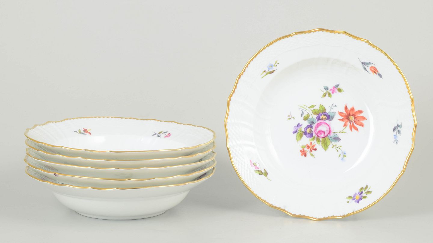Sæt af seks dybe tallerkner i porcelæn dekoreret med håndmalede blomster i saksisk blomst-mønster og afsluttet med forgyldt kant. Model 21/1616. 1. sortering.