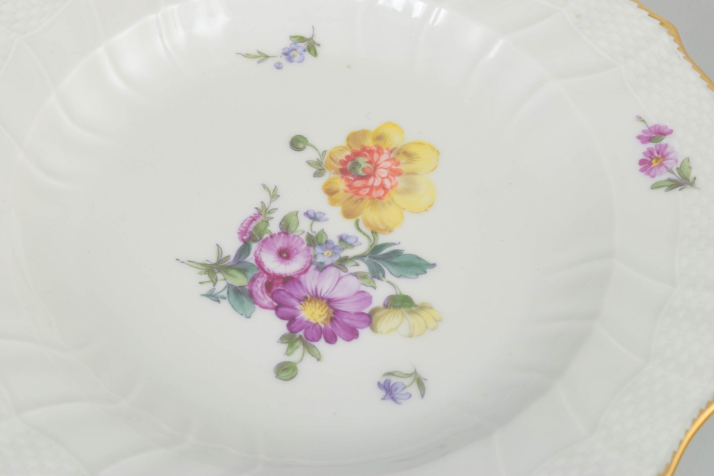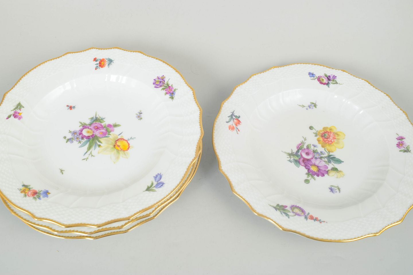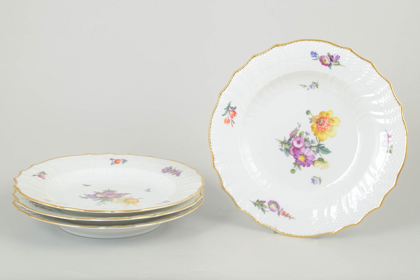 Elegant sæt af fire middagstallerkner i porcelæn dekoreret med håndmalede blomster i saksisk blomst-mønster og afsluttet med forgyldt kant. Model 4/1621. 1. sortering.