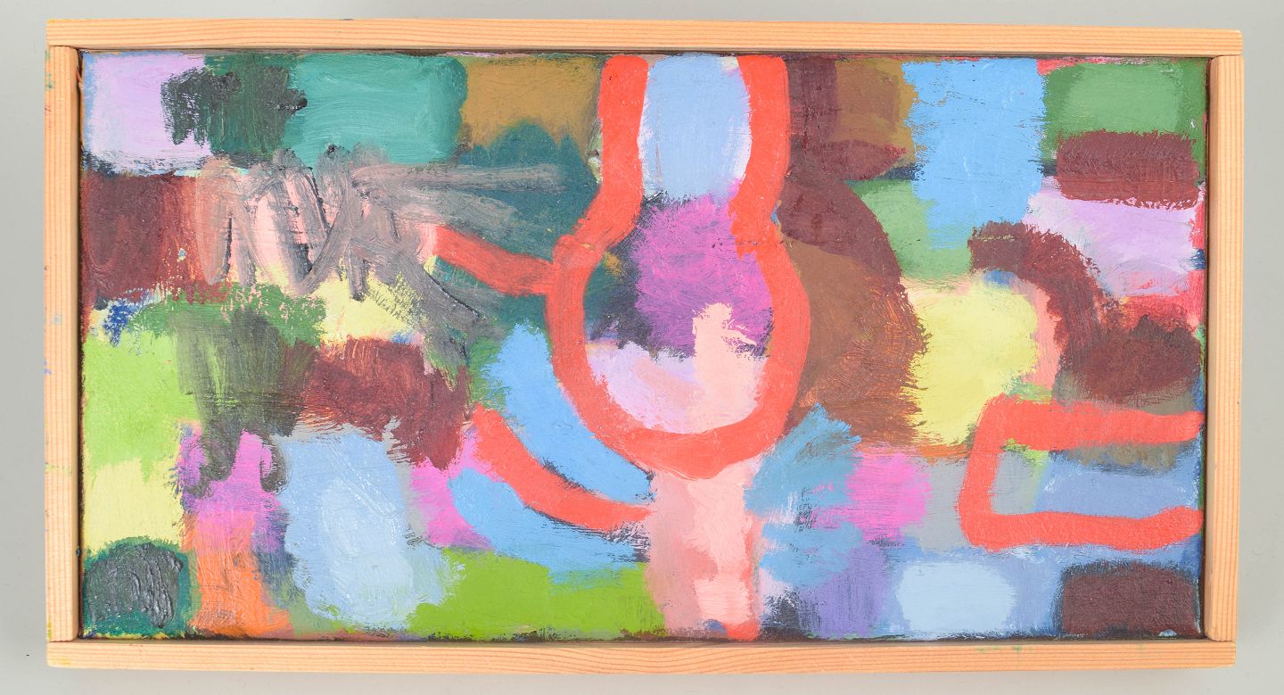 Abstrakt komposition med geometriske former og kraftfulde farvefelter udført i olie på lærred, usigneret.