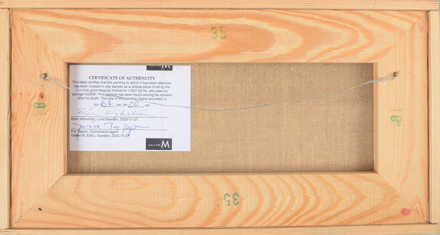 Magnus Wijkström (1957–2019) var en svensk kunstner opvokset i Eslöv. Han uddannede sig først på Pernbys Målarskola i Stockholm og blev senere optaget på Valands Konsthögskola i Göteborg i 1983, hvor han studerede i fem år. Efter endt uddannelse bosatte han sig i Malmö, hvor han arbejdede som kunstner. Hans værker er kendetegnet ved geometriske motiver og stærke farvekombinationer, ofte med en spontan og eksperimenterende tilgang til form og komposition. Wijkström udstillede både i Sverige og internationalt og opnåede anerkendelse, selvom han levede et relativt tilbagetrukket liv.