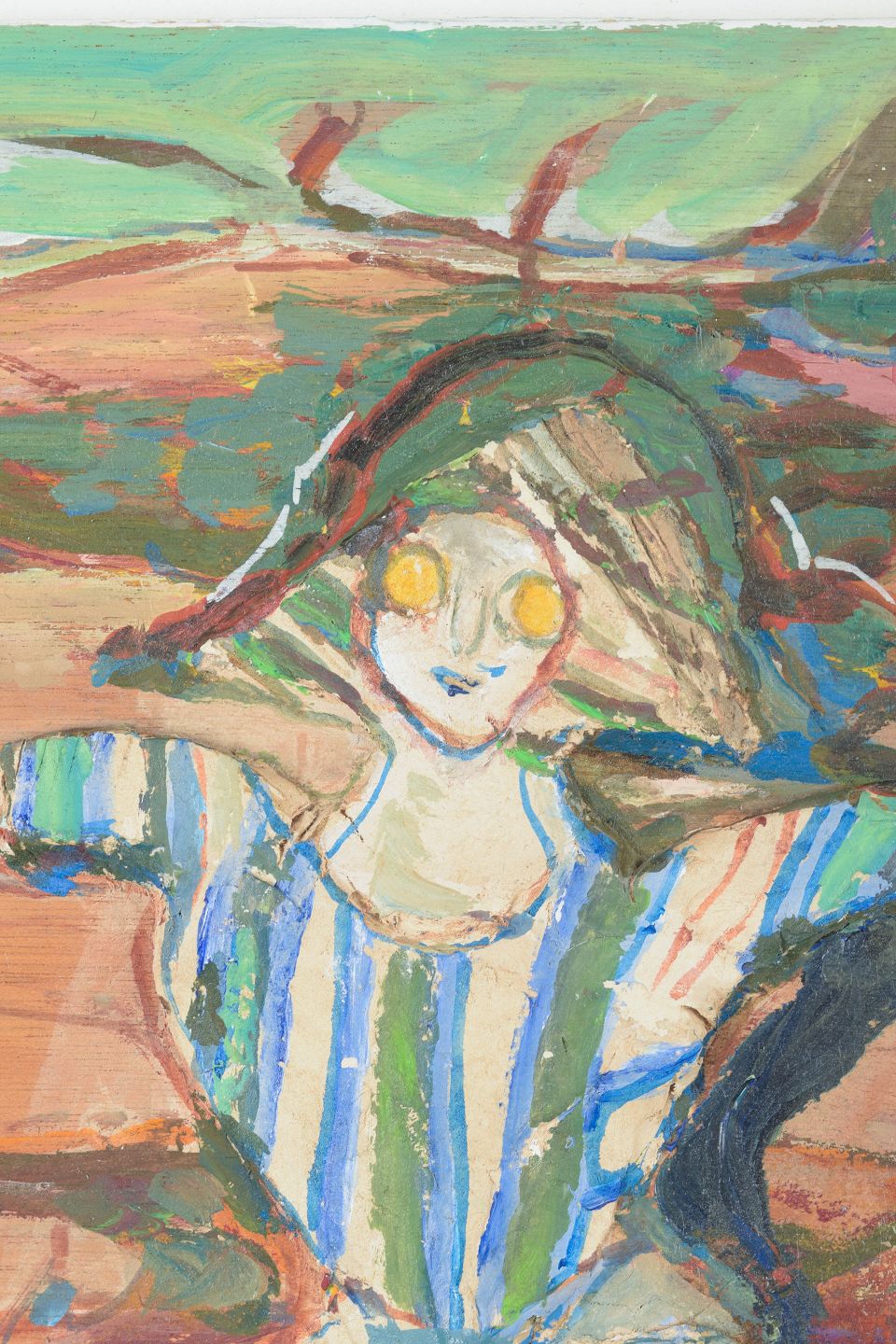 Simone Picciotto was born in Cairo into an Italian family and has lived in Belgium, Italy, and France, where she later settled. She received a first prize at the Fine Arts Academy in Brussels and worked in Paris in the ateliers of Fernand Léger and later Jean Deyrolle. Her work is characterised by highly imaginative and poetic compositions, combining diverse and often worn materials into richly coloured surfaces. Figures and faces are frequently layered and shown from multiple angles, creating a distinctive and evocative visual language.