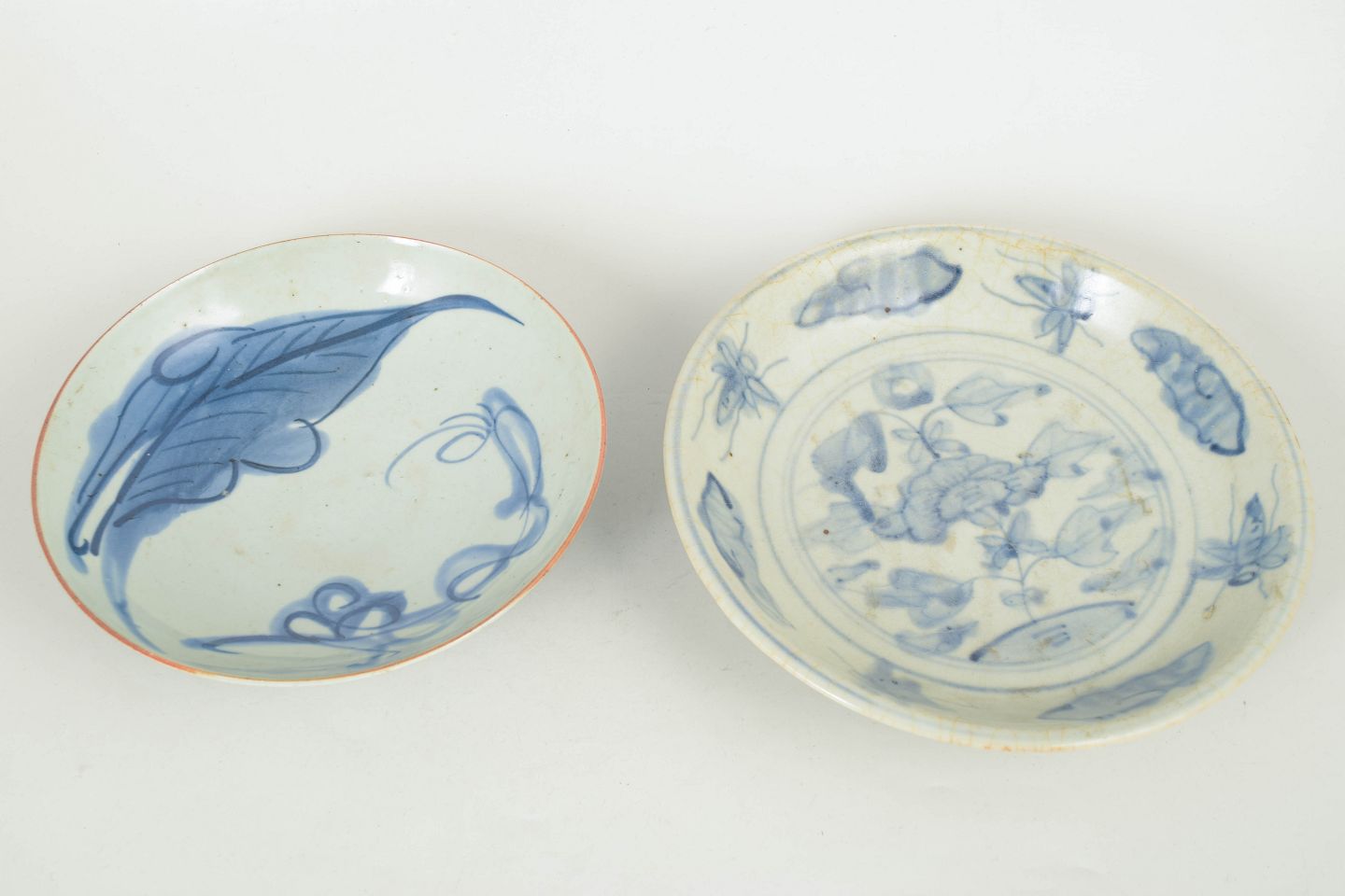To hånddrejede porcelænsskåle med håndmalet blå dekoration under glasur, med klassiske motiver fra perioden.