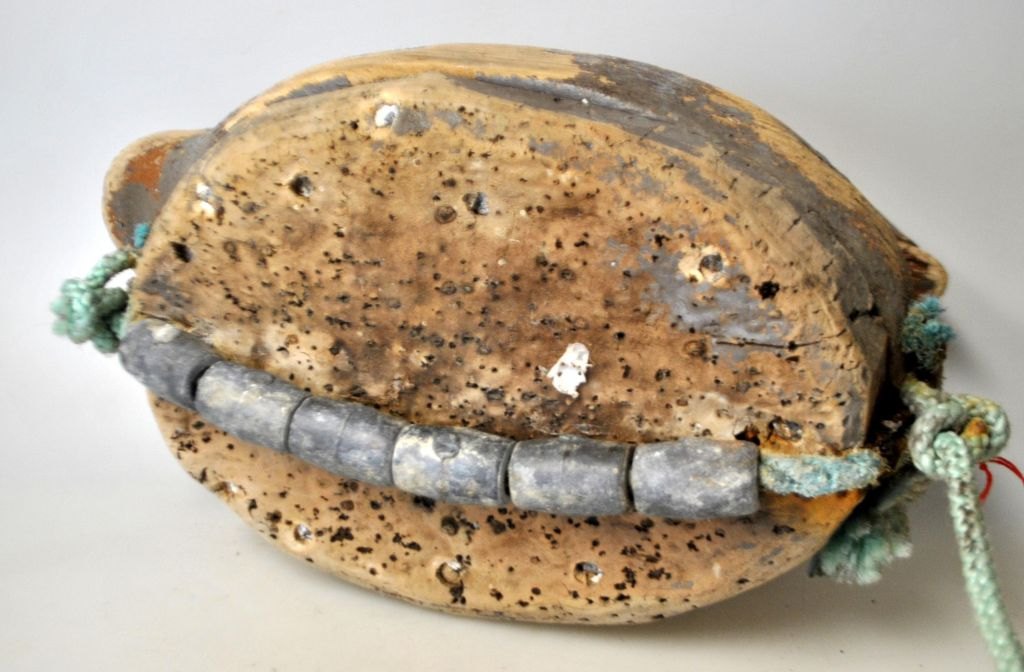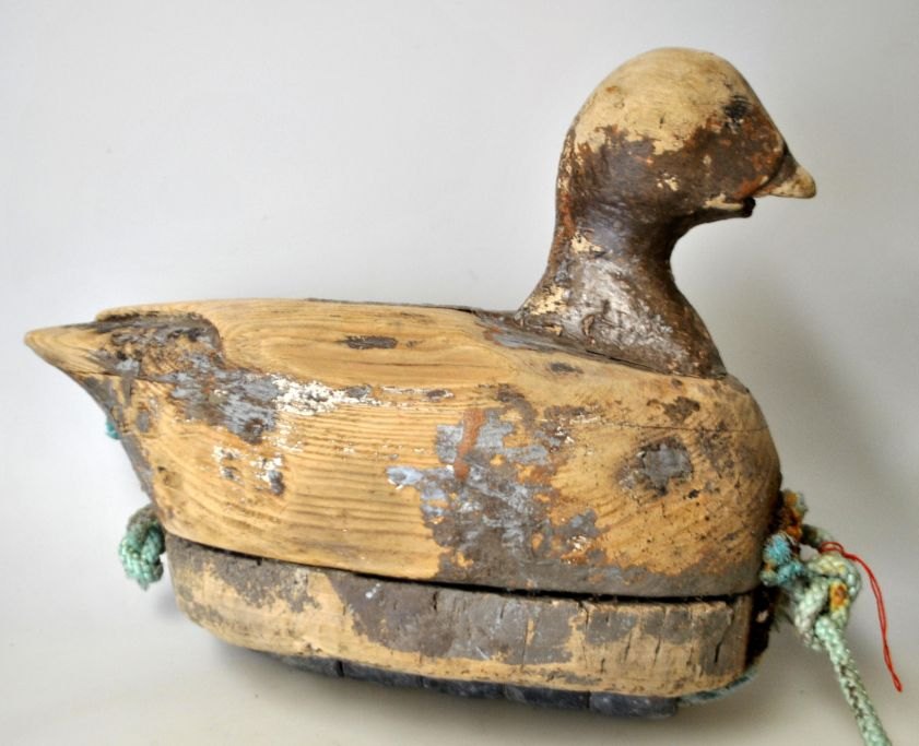 Lokkeand i træ og kork, ca. 1900. Danmark. Tidiligere med bemaling. Med blylodder som vægt. L.: 30 cm. H: 24 cm.