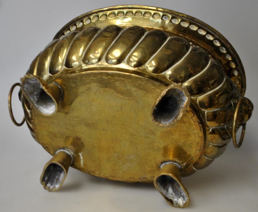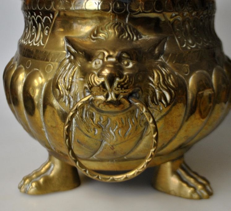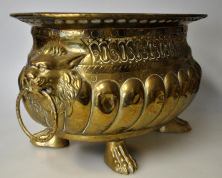 Dansk urtepotteskjuler i messing, 19. årh. Med løvefødder. Dekoreret med to løvehoveder med ringe i mund. H.: 17 cm. Dia.: 31 cm.