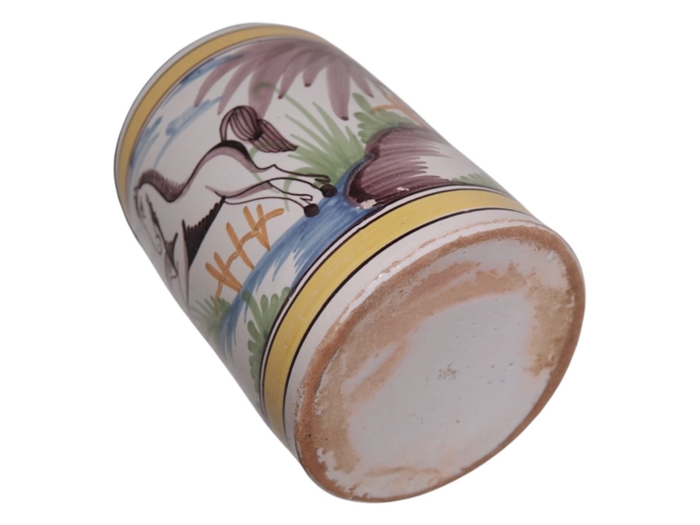 Large faience mug decorated with a horse. There is a tin lid that has a later inscription from 1833. The mug was made between 1790 and 1810.