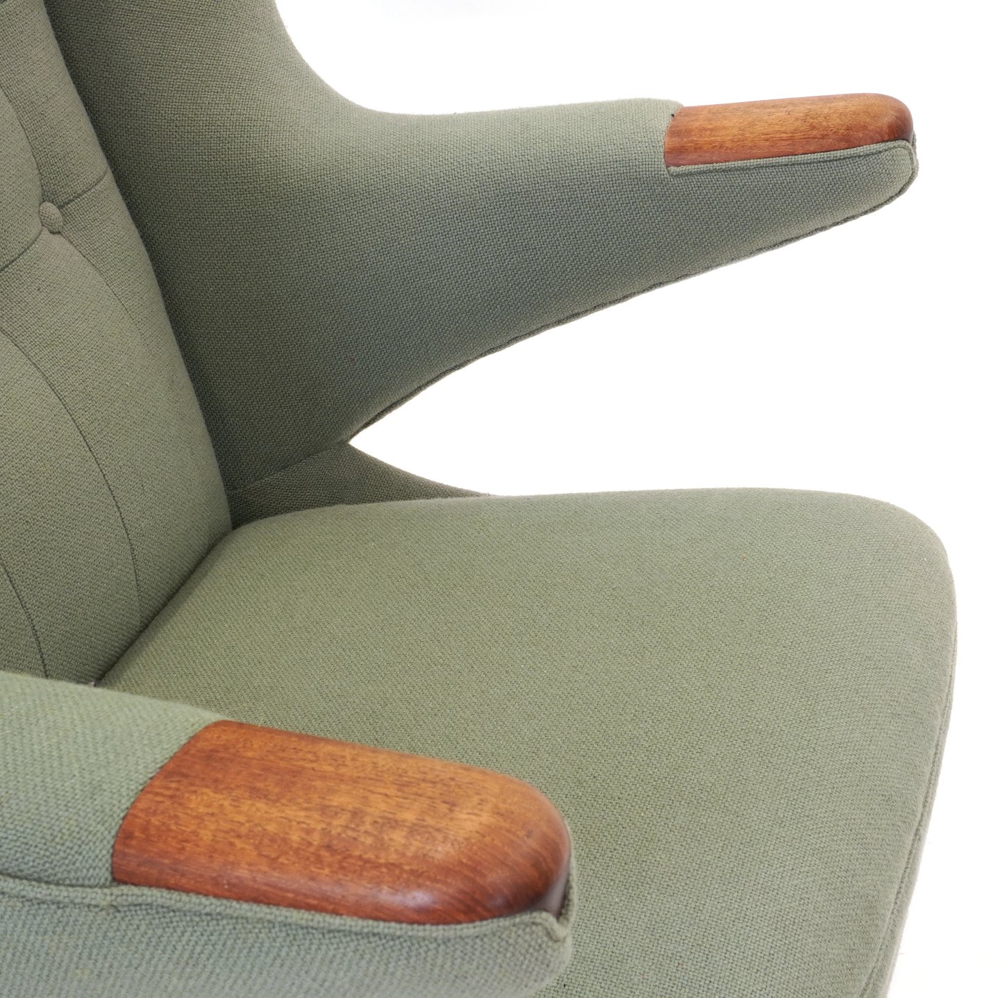 Hans J. Wegner Bamsestol med fodskammel. Hans Jørgen Wegner, 1914-2001, Bamsestol med fodskammel. Negle og håndtag udført i teak. AP19 og AP29. God stand med nyere polstring. Lette brugsspor