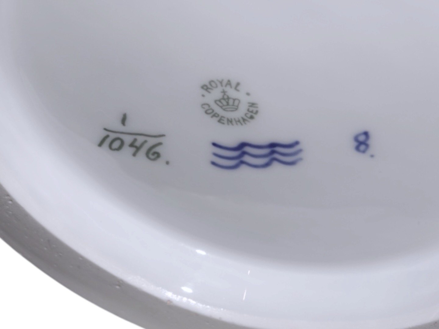 Der er en lille bitte smule slid på guldkanten og et enkelt sted på topkanten er der et lille og medfødt prik i glasuren, se næstsidste foto, ellers perfekt stand uden fejl.