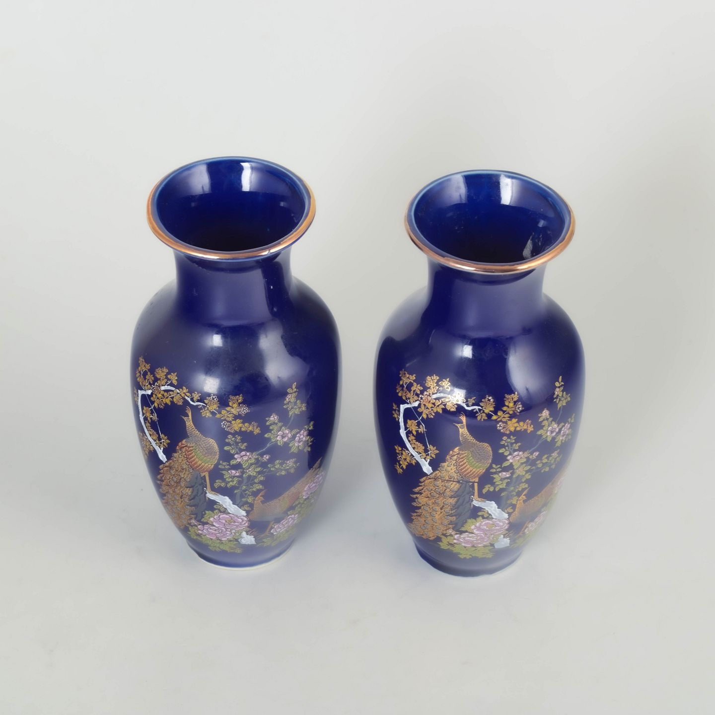 Elegant par vaser i glaseret porcelæn med dyb blå bundfarve og rigt dekorerede motiver af påfugle, blomster og natur i forgyldte og polykrome nuancer. Mærket med producentmærkat fra Japan på undersiden.