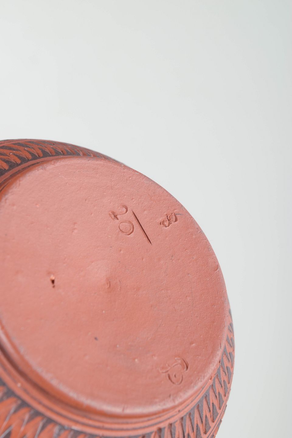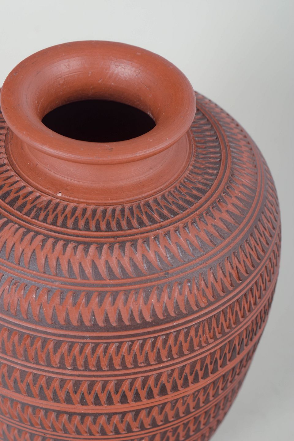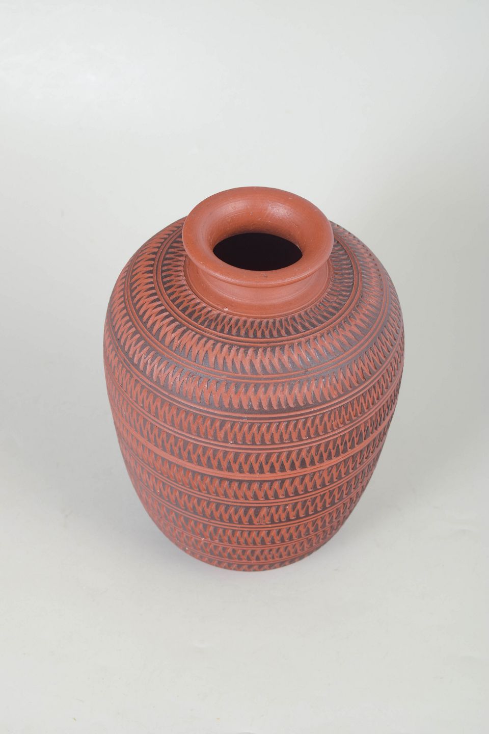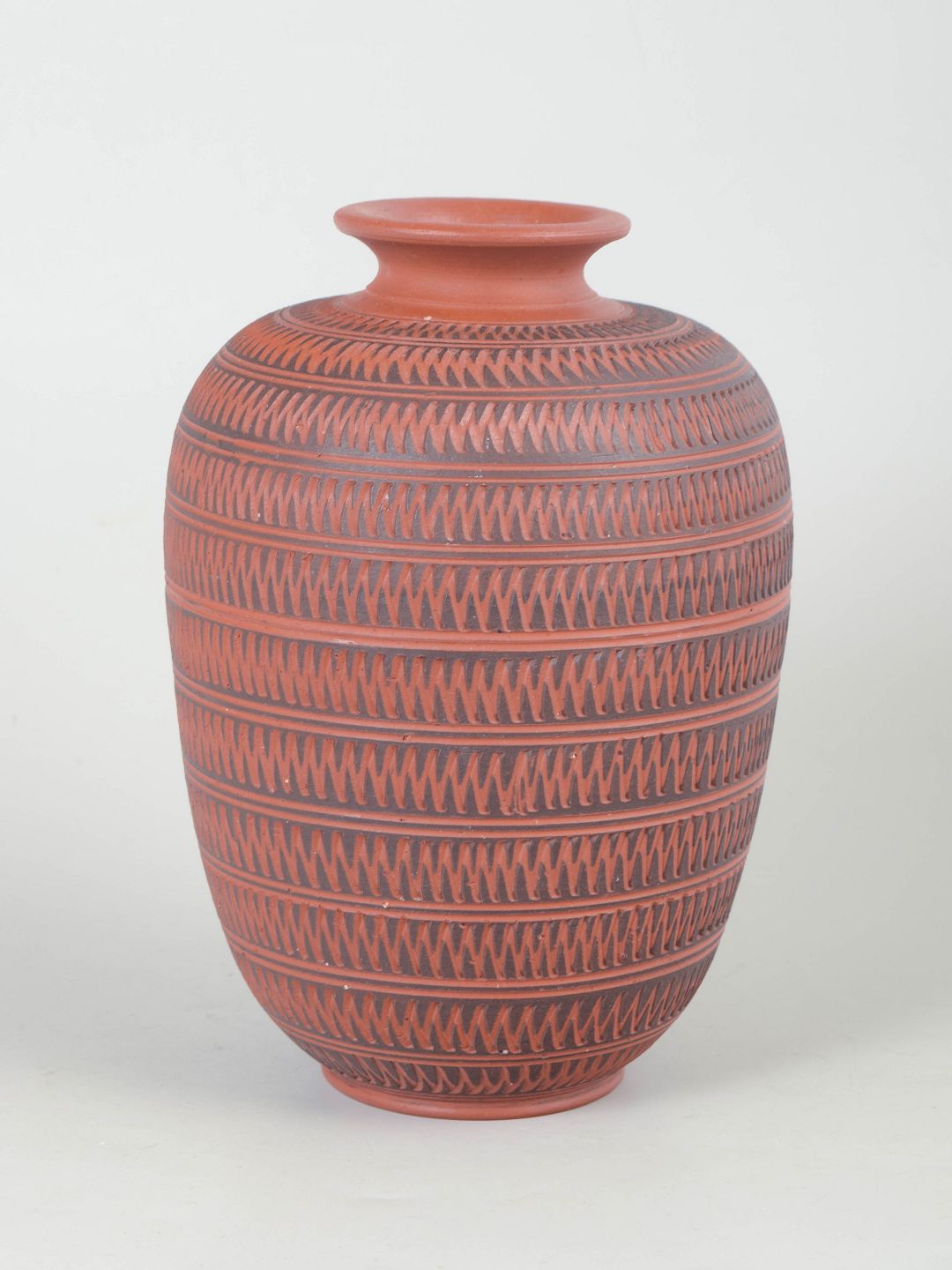 Dekorativ vase i rødbrændt terrakotta med fint indridset og gentaget geometrisk mønster i horisontale bånd. Formen er klassisk med let udsvajet hals og balusterformet krop. Mærket under bunden, men utydeligt.