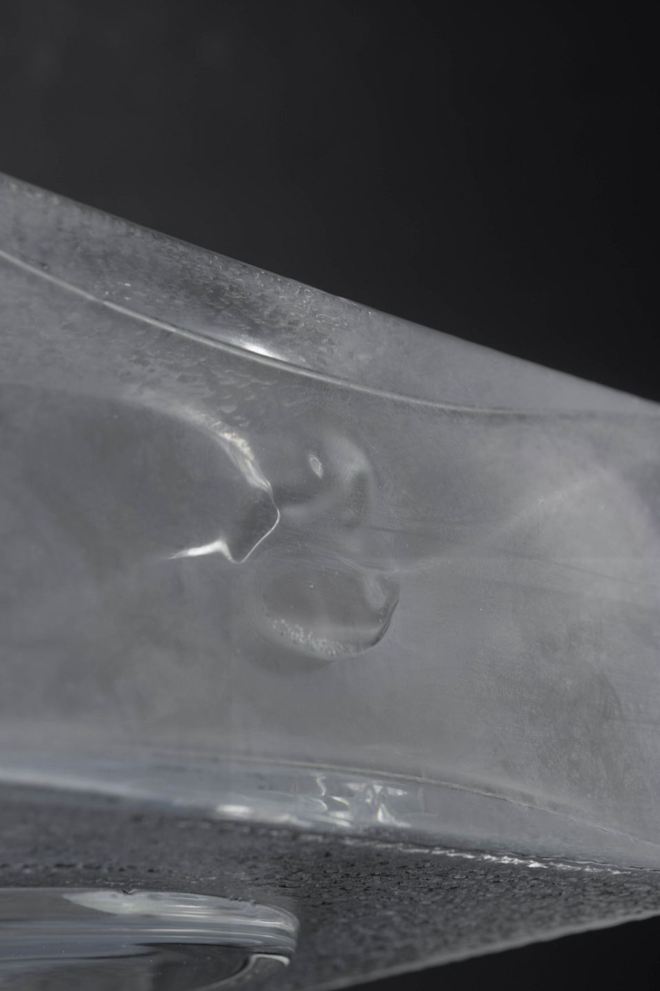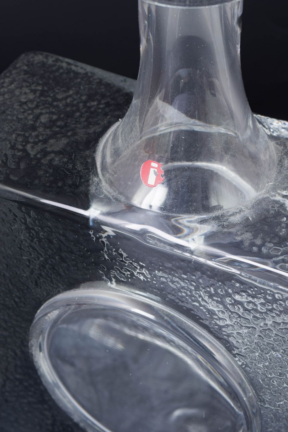 Kraftig kvadratisk glasflaske med integreret rund fordybning på fronten og kort hals. Udført i klart glas med let rå struktur på siderne. Original producentmærkat bevaret.