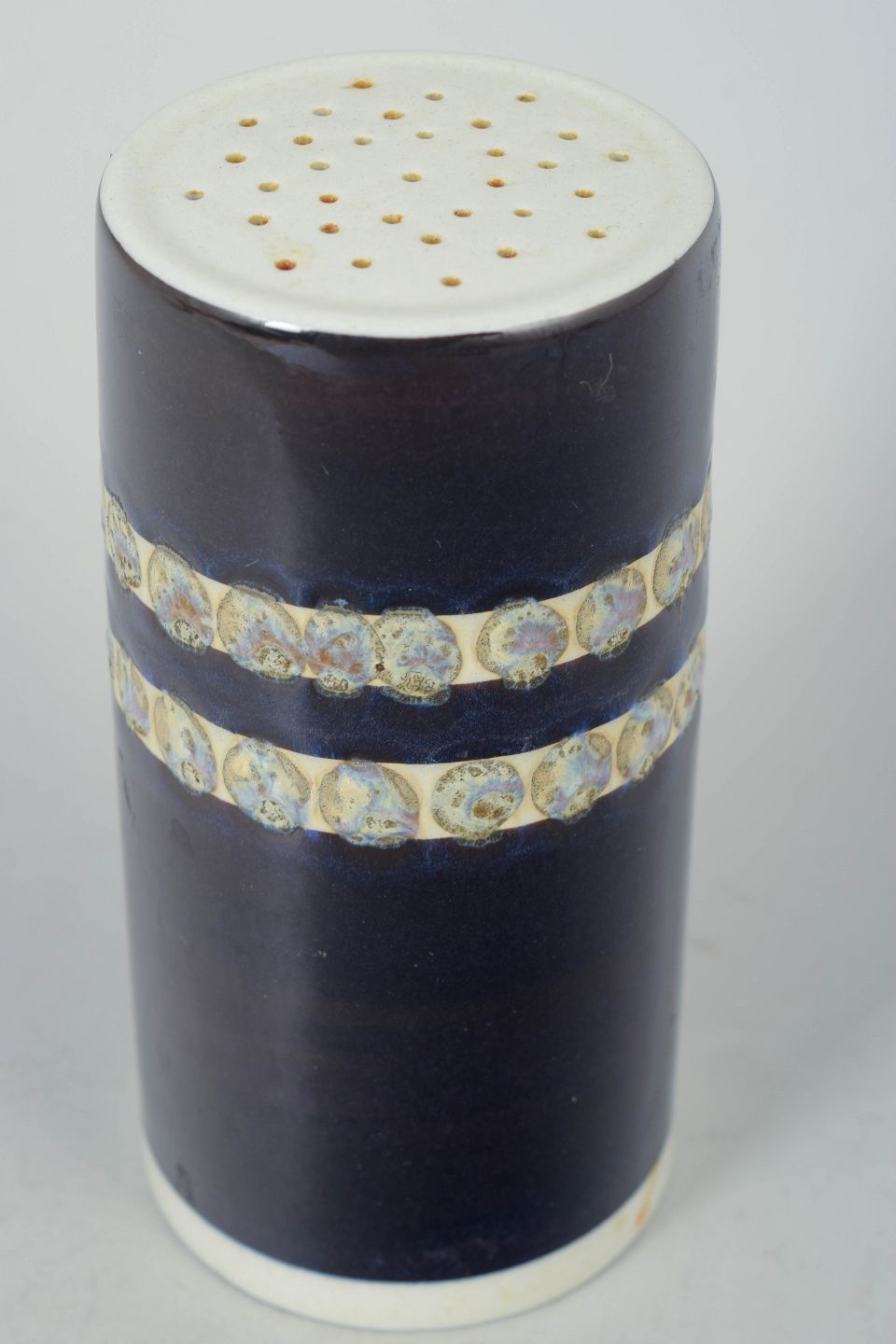 Porcelæn sukkerstrøer fra 1956, model 584/2994, udført i cylindrisk form med dyb blå glasur og dekorative bånd med stiliseret motiv.