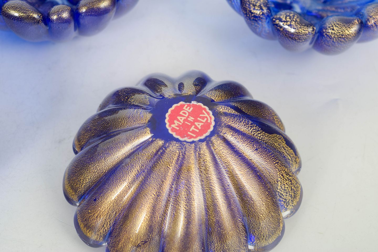 Fem små skåle i formpresset glas med rillet, bølget form og dekorativ overflade i blå og gyldne toner.