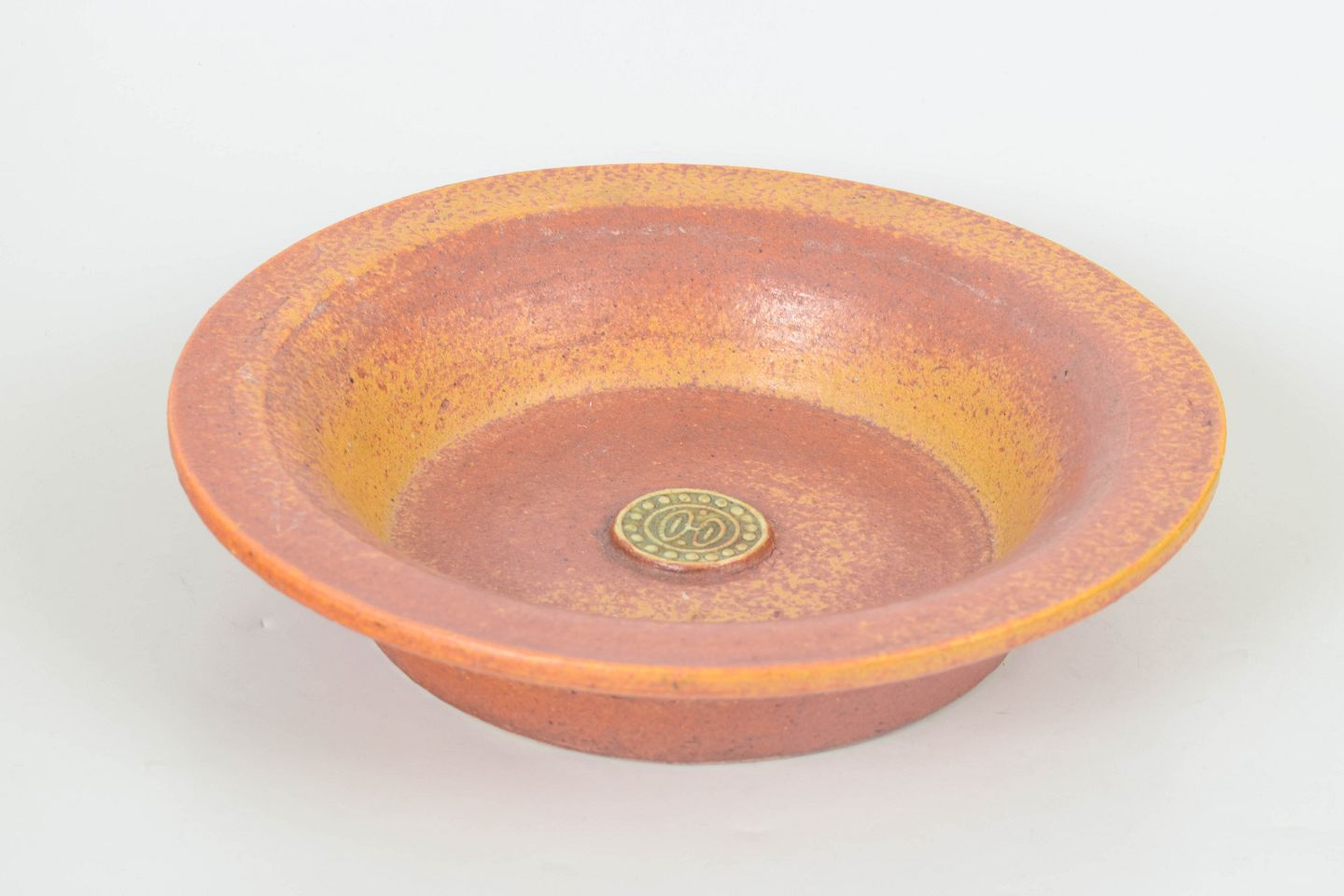 Stor skål i stentøj med karakteristisk “Sahara” glasur i varme nuancer af orange, okker og brun med let granuleret overflade og centralt fabriksmærke.