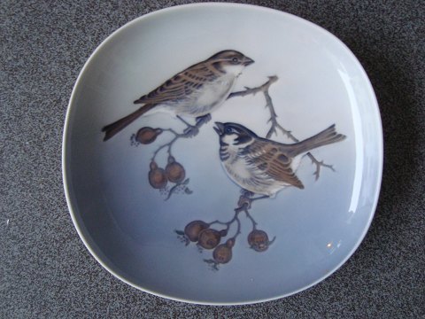 Text available in Danish: Kongelig skål dekoreret med spurve på grene.