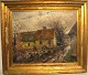 Maleri - bymotiv med gadehandler og kunder af Carl Lander.