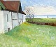 Maleri af Jacob Meyer - Landskab med udhuse 1953.