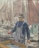 Maleri V. Feilberg - Havneparti med arbejdende fiskere ved deres både.