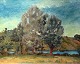 Maleri - Knud Bøstrup - Klitparti med graner og gård.