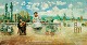 Maleri af Peder Brøndum Sørensen - Landskab med huse og personer 1955.