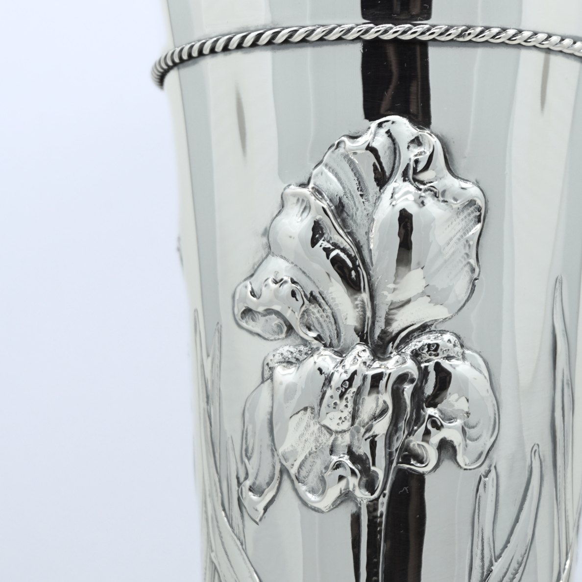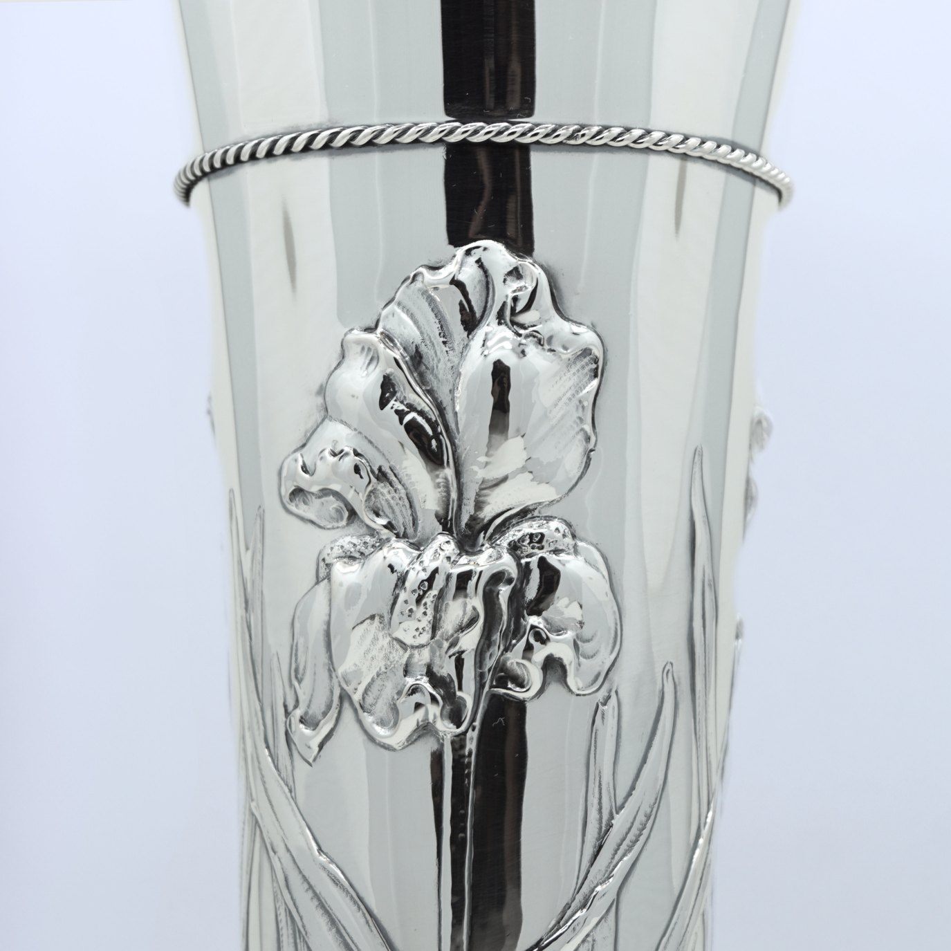 Tall silver vase in early Danish Art Nouveau style, decorated with flowers and twisted silver thread.