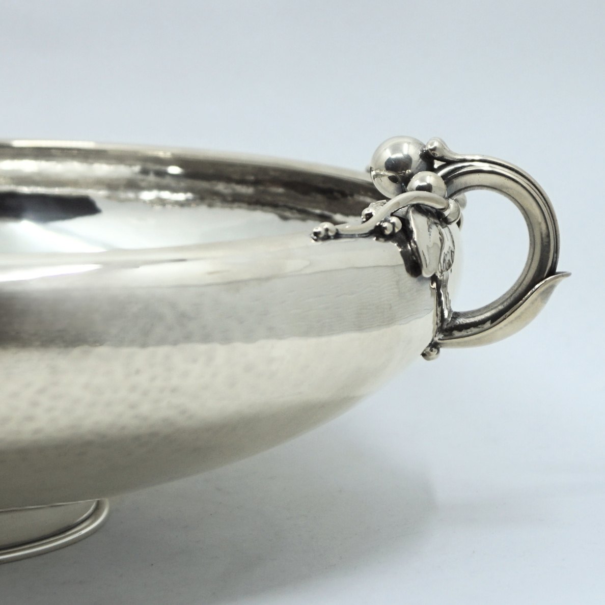 Round centerpiece of lightly hammered sterling silver, adorned with two handles.