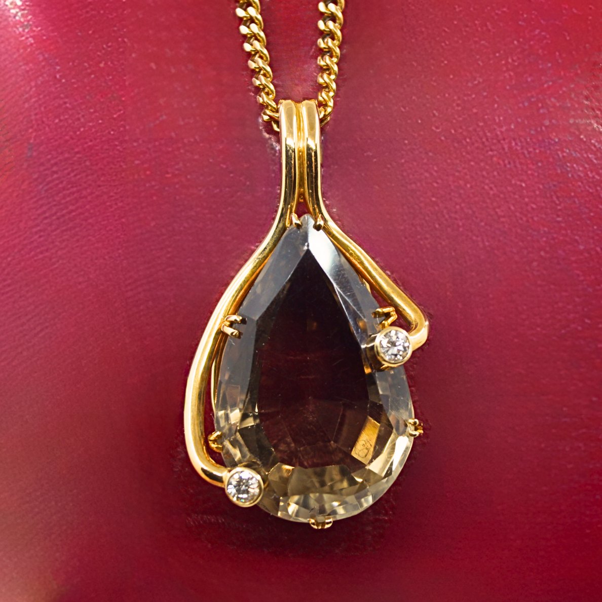 Long necklace in 14k gold, pendant set with a large topaz and two diamonds, total 0.20 ct.
