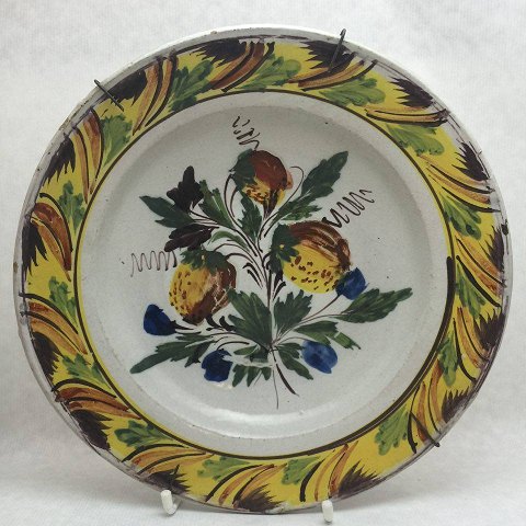 Kellinghusen dyb tallerken af fajance dekoreret i farver med jordbær. Danmark 1763 - 1860. Diameter 26 cm.