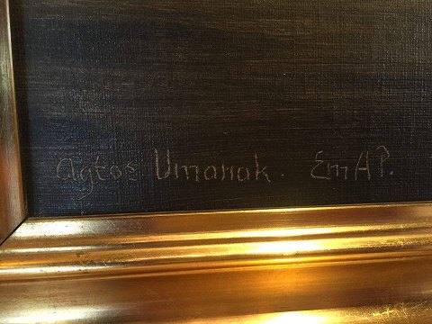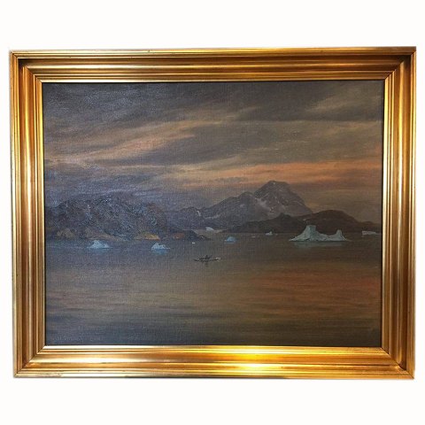 Emanuel A. Petersen, maleri af kajakroer på grønlandsk fjord, motiv fra Grønland, "Agtos Umanak". Sign. "Em. A. P." samt "Agtos Umanak". Olie på lærred. Lysmål: H. 51,5 cm. L. 65 cm. Med ramme: H. 61,5 cm. L. 75 cm. Emanuel A. Petersen, f. Frederiksberg 1894, d. Farum 1948