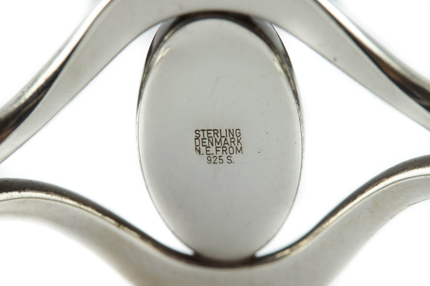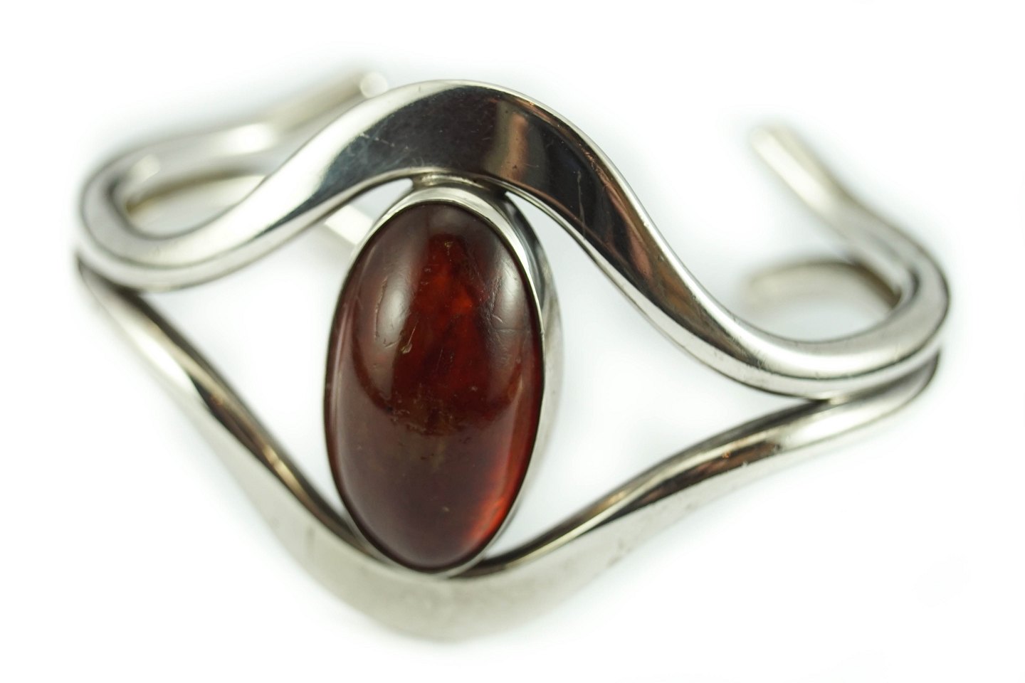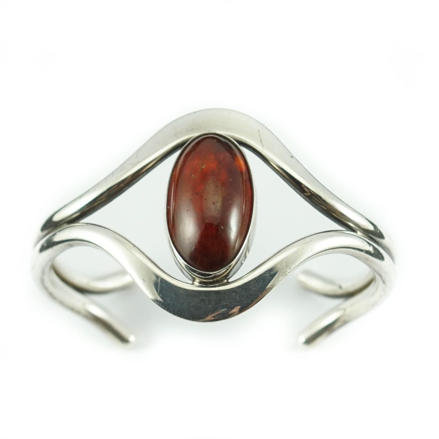 N. E. From smykke. Niels Erik From; Armring i sterlingsølv med rav. Stemplet "Sterling, Denmark, N. E. From, 925S".