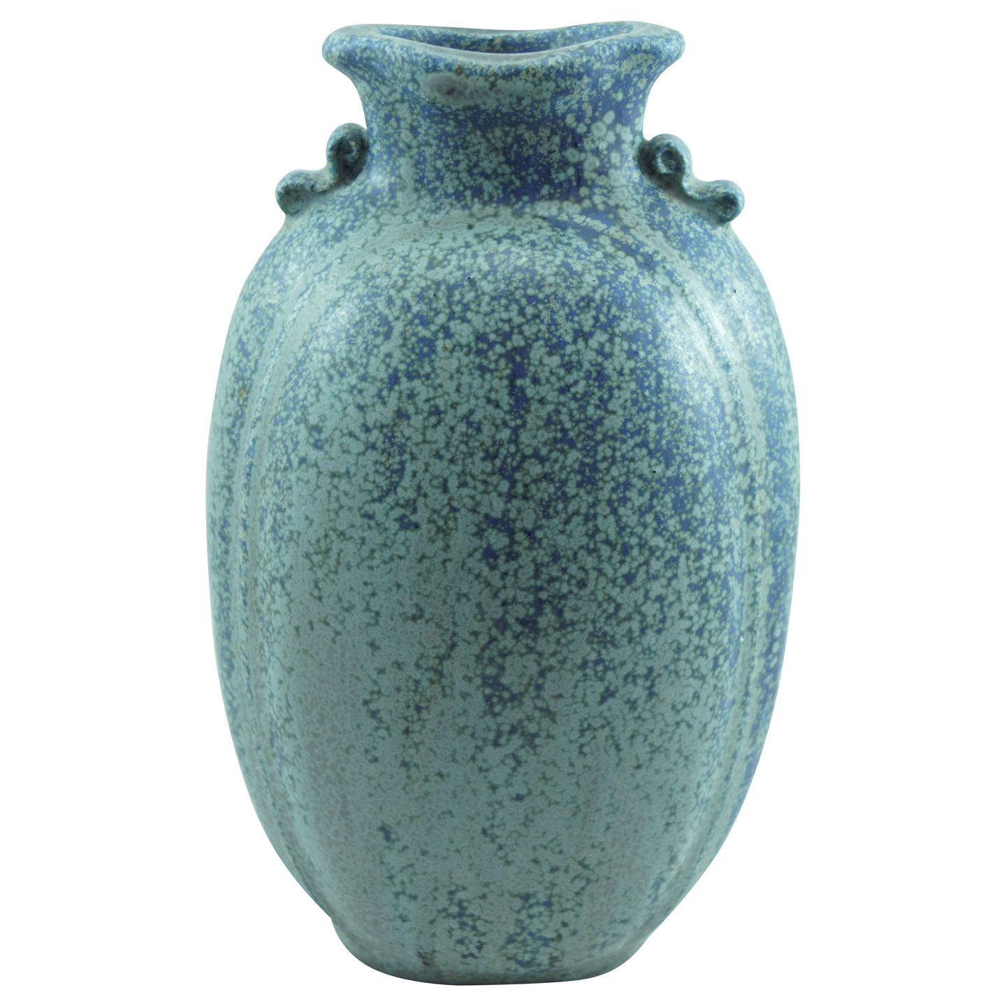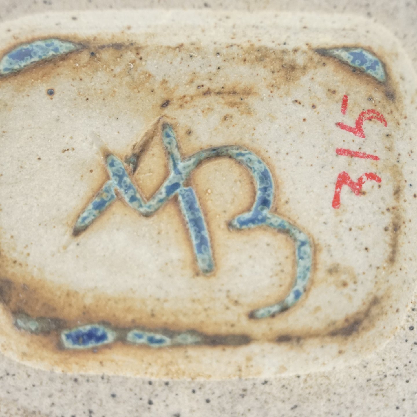 Dekoreret med blålig- og grålig glasur. H. 17,2 cm. B. 11 cm.