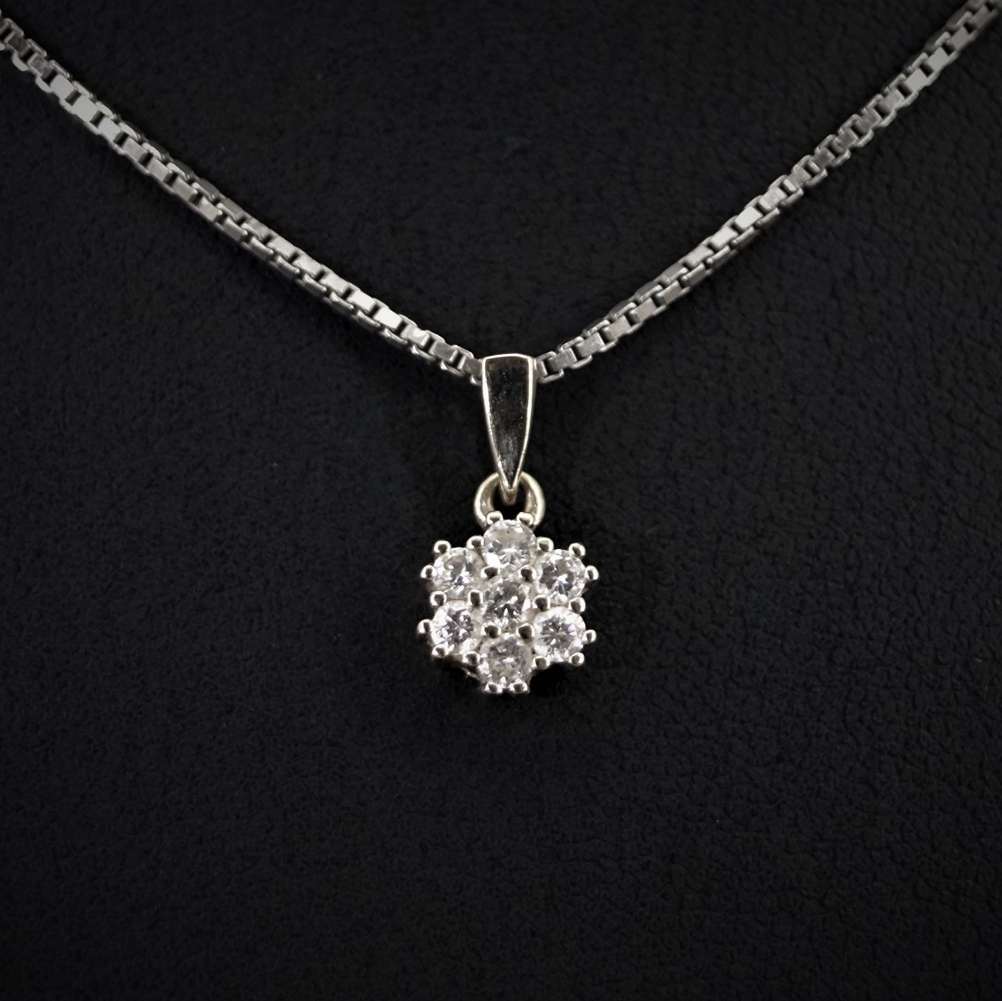 Diamantvedhæng af 14 kt. hvidguld i 14 kt. hvidguldskæde. Syv diamanter, i alt 0.35 ct. Vedhæng diam. 8 mm. Halskæde l. 42,5 cm.