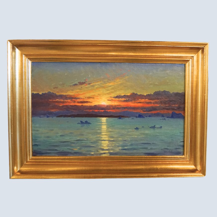 Emanuel A. Petersen grønlandsk oliemaleri med motiv af solnedgang ud for Christianshaab / Qasigiannguit.