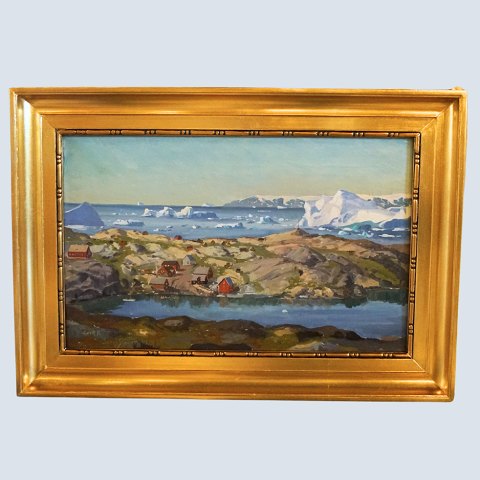 Emanuel A. Petersen grønlandsk oliemaleri med motiv af Jakobshavn / Ilulissat, år 1924
