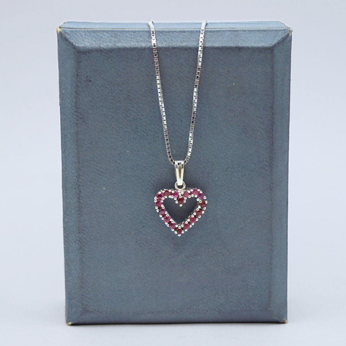 Henrik Solskov; Halskæde i 14 kt. hvidguld med hjertevedhæng prydet med rubiner. Hvidguldskæde længde 42 cm. Rubinhjerte i 14 kt. hvidguld h. 1,3 cm, b. 1,4 cm.